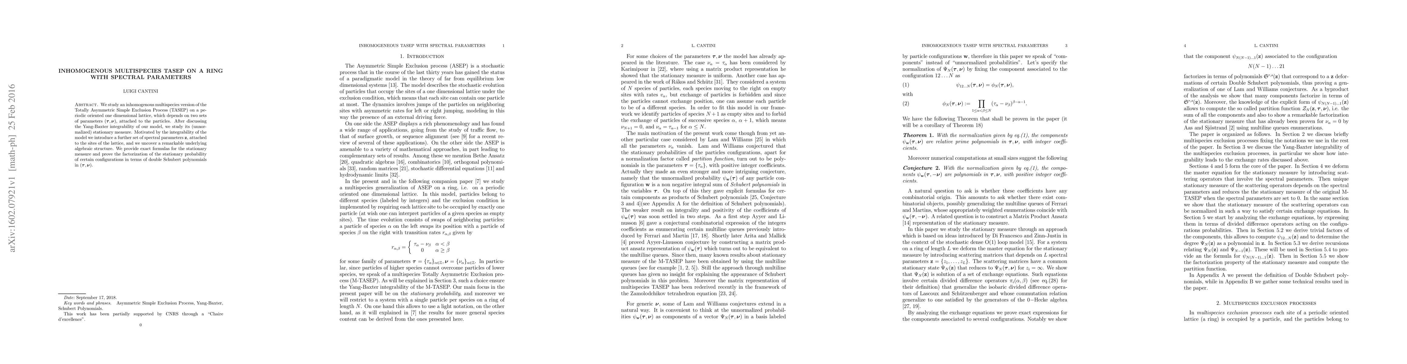 This paper investigates an inhomogeneous multispecies Totally Asymmetric Simple Exclusion Process (TASEP) on a ring, introducing spectral parameters and proving Yang-Baxter integrability. It uncovers an algebraic structure and provides exact formulas for the stationary measure, factorizing probabilities in terms of double Schubert polynomials.