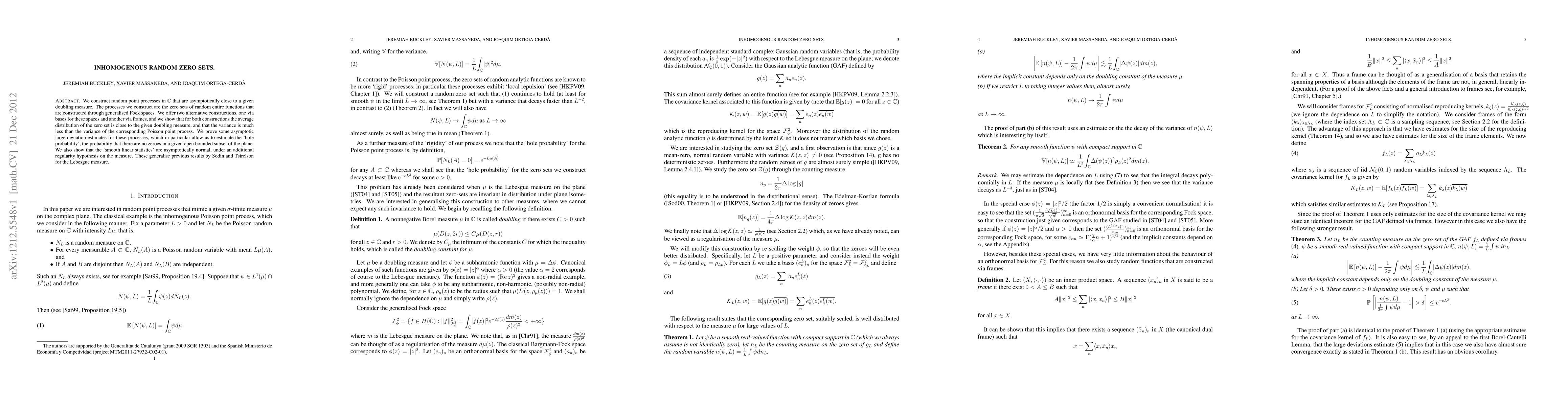 We construct random point processes in the complex plane that are asymptotically close to a given doubling measure. The processes we construct are the zero sets of random entire functions that are constructed through generalised Fock spaces. We offer two alternative constructions, one via bases for these spaces and another via frames, and we show that for both constructions the average distribution of the zero set is close to the given doubling measure, and that the variance is much less than the variance of the corresponding Poisson point process. We prove some asymptotic large deviation estimates for these processes, which in particular allow us to estimate the `hole probability', the probability that there are no zeroes in a given open bounded subset of the plane. We also show that the `smooth linear statistics' are asymptotically normal, under an additional regularity hypothesis on the measure. These generalise previous results by Sodin and Tsirelson for the Lebesgue measure.