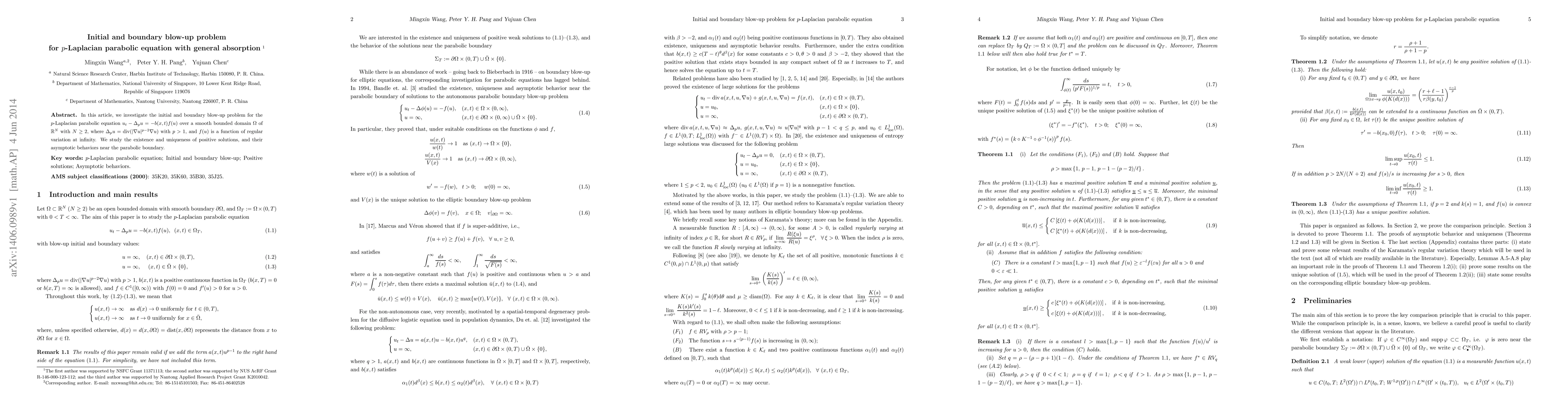 This paper investigates the initial and boundary blow-up phenomena for a $p$-Laplacian parabolic equation with general absorption, focusing on the existence, uniqueness, and asymptotic behavior of positive solutions near the parabolic boundary.