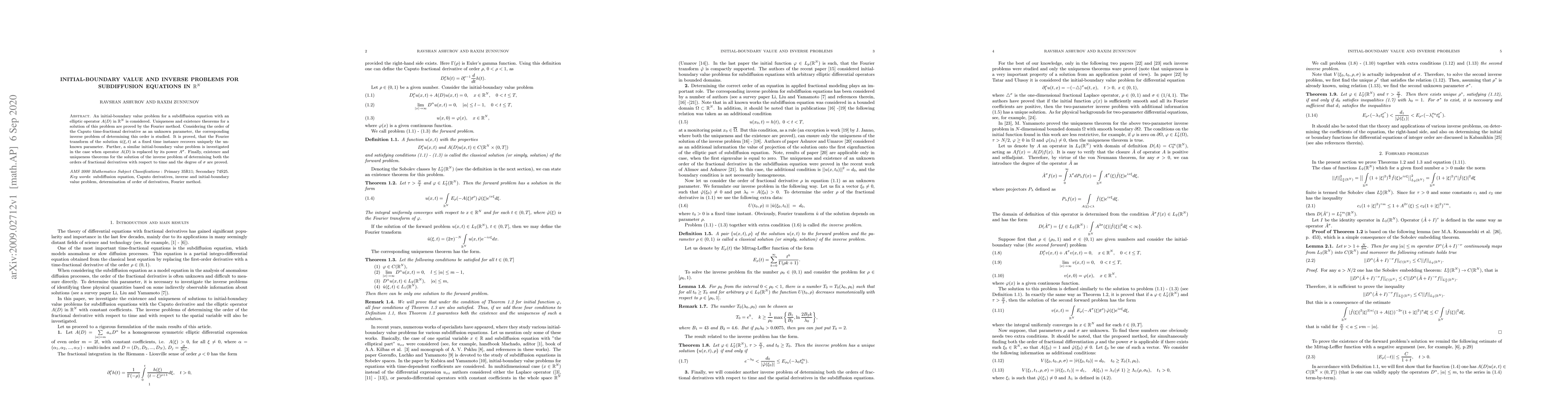 An initial-boundary value problem for a subdiffusion equation with an elliptic operator $A(D)$ in $\mathbb{R}^N$ is considered. The existence and uniqueness theorems for a solution of this problem are proved by the Fourier method. Considering the order of the Caputo time-fractional derivative as an unknown parameter, the corresponding inverse problem of determining this order is studied. It is proved, that the Fourier transform of the solution $\hat{u}(\xi, t)$ at a fixed time instance recovers uniquely the unknown parameter. Further, a similar initial-boundary value problem is investigated in the case when operator $A(D)$ is replaced by its power $A^\sigma$. Finally, the existence and uniqueness theorems for a solution of the inverse problem of determining both the orders of fractional derivatives with respect to time and the degree $ \sigma $ are proved. We also note that when solving the inverse problems, a decrease in the parameter $\rho$ of the Mettag-Leffler functions $E_\rho$ has been proved.