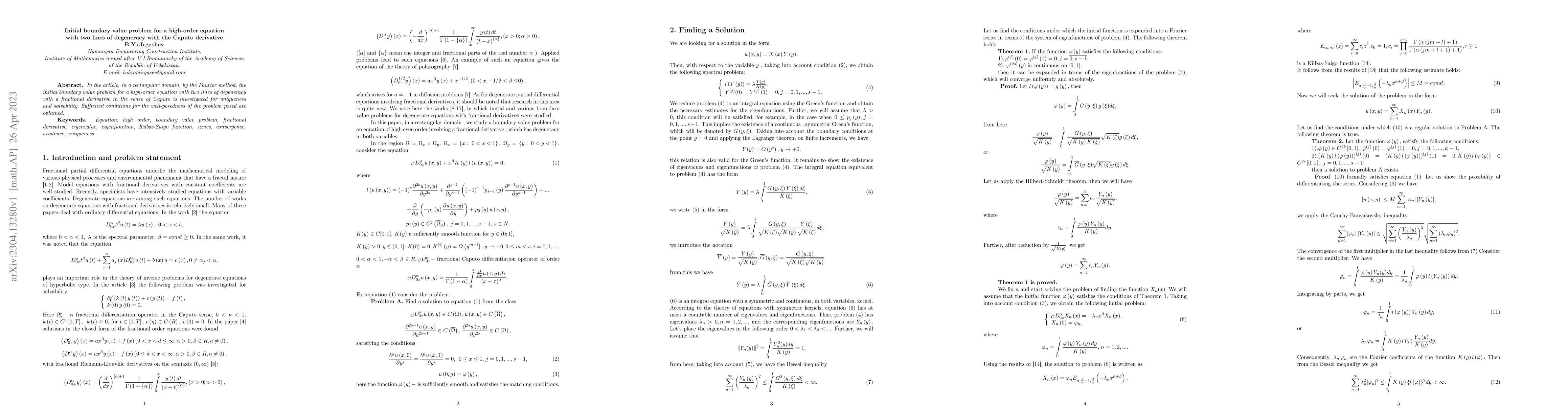 The paper investigates the initial boundary value problem for a high-order equation with two lines of degeneracy featuring a Caputo fractional derivative, establishing sufficient conditions for its uniqueness and solvability using the Fourier method. Results confirm the well-posedness of the problem.