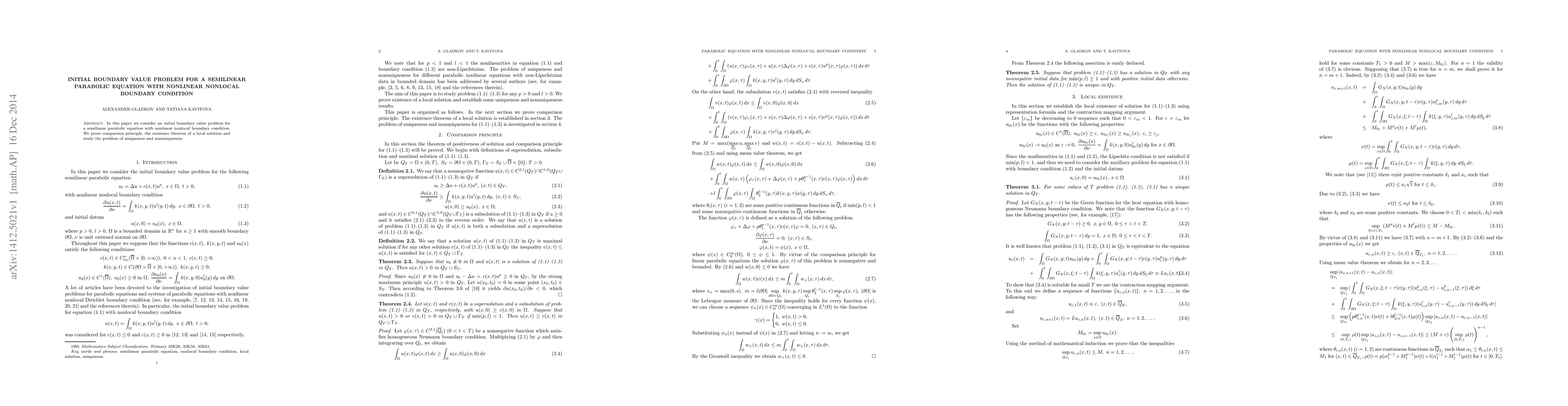 This paper investigates an initial boundary value problem for a semilinear parabolic equation featuring a nonlinear nonlocal boundary condition. It establishes a comparison principle, proves the existence of a local solution, and examines issues of uniqueness and nonuniqueness.