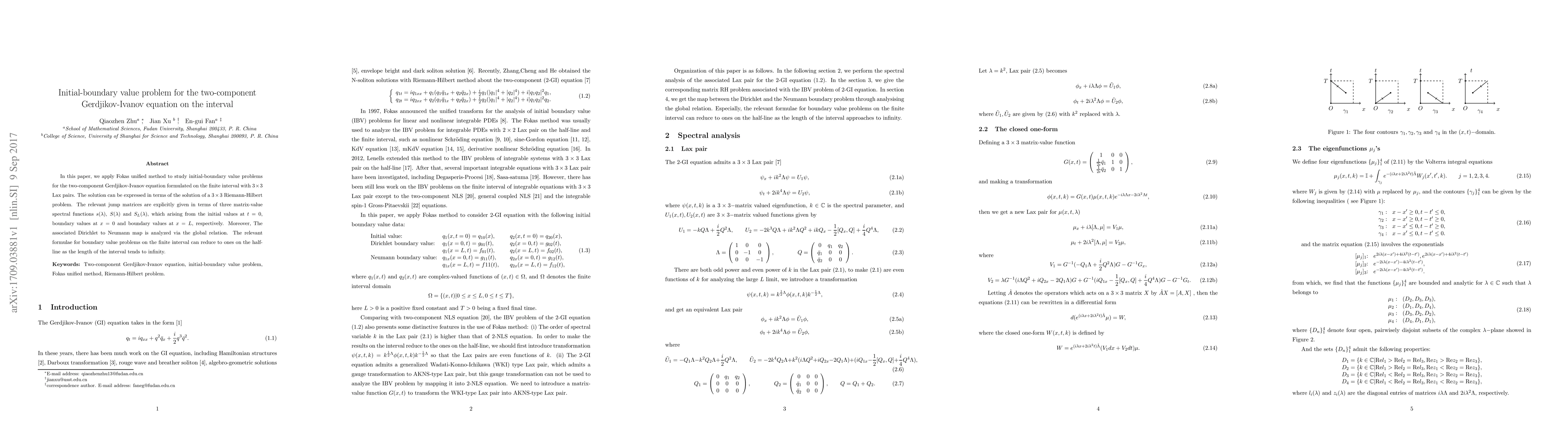 This paper utilizes the Fokas unified method to solve initial-boundary value problems for the two-component Gerdjikov-Ivanov equation on a finite interval, expressing the solution through a $3\times3$ Riemann-Hilbert problem with explicit jump matrices derived from spectral functions. The study also analyzes the Dirichlet to Neumann map and shows the reduction of boundary value formulae to half-line problems as the interval length approaches infinity.