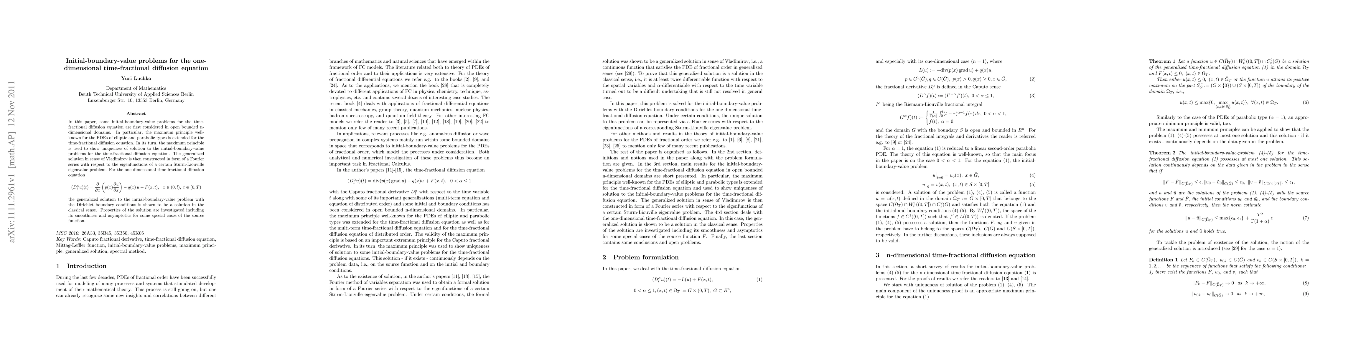 This paper extends the maximum principle to the time-fractional diffusion equation and uses it to prove the uniqueness of solutions to initial-boundary-value problems. It constructs generalized solutions in the form of Fourier series and shows that for the one-dimensional case, these solutions are classical under Dirichlet boundary conditions.