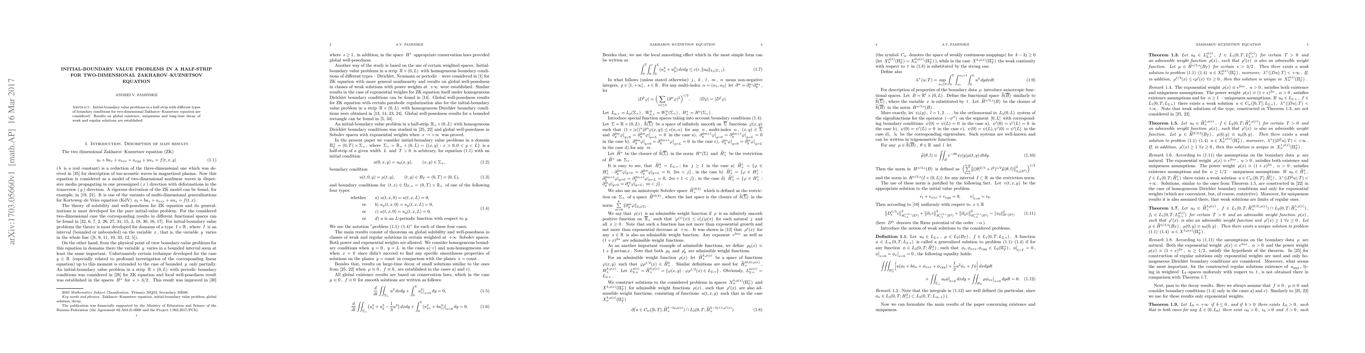This paper investigates initial-boundary value problems for the two-dimensional Zakharov-Kuznetsov equation in a half-strip, establishing results on global existence, uniqueness, and long-time decay for both weak and regular solutions under various boundary conditions.