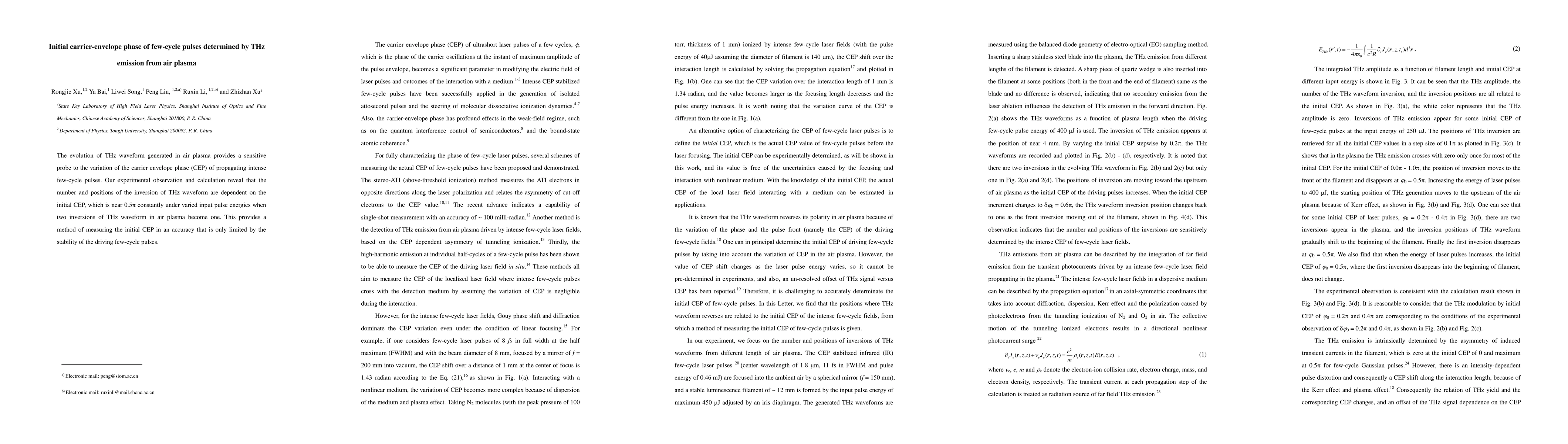 This paper presents a method to determine the initial carrier-envelope phase (CEP) of few-cycle pulses by analyzing THz waveform inversions generated from air plasma. The study finds that the number and positions of THz waveform inversions depend on the CEP, allowing for precise CEP measurement limited mainly by pulse stability.