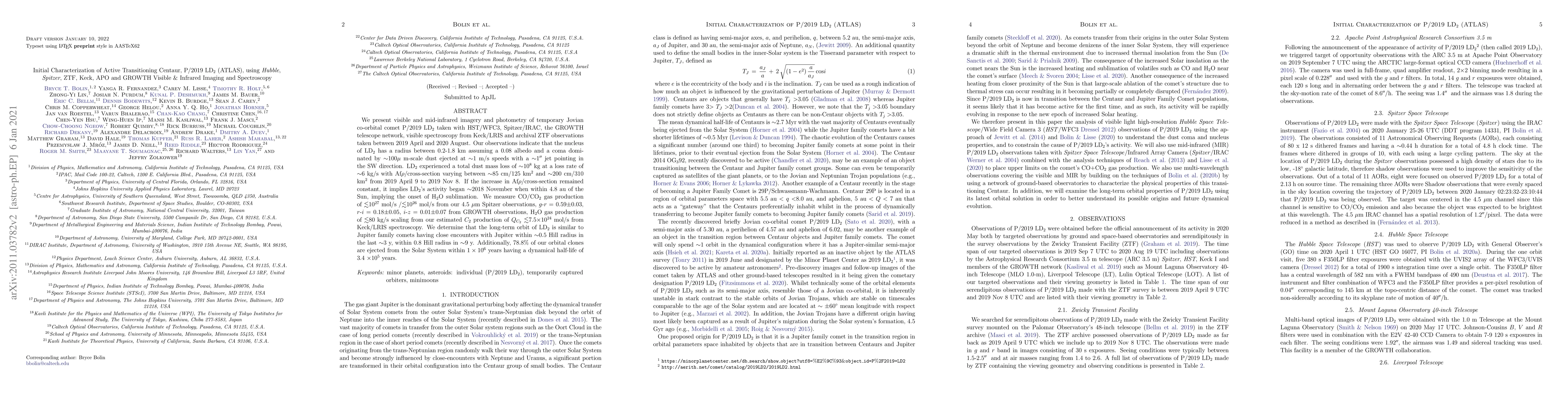The ATLAS comet P/2019 LD2 was studied using various telescopes, revealing a radius of 0.2-1.8 km and a highly active dust coma with gas production of CO, CO2, and H2O.