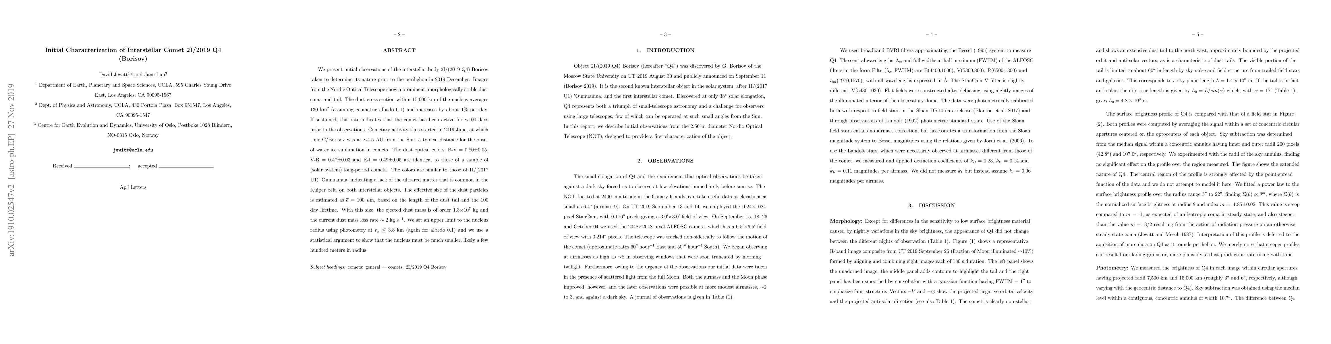 We present initial observations of the interstellar body 2I/(2019 Q4) Borisov taken to determine its nature prior to the perihelion in 2019 December. Images from the Nordic Optical Telescope show a prominent, morphologically stable dust coma and tail. The dust cross-section within 15,000 km of the nucleus averages 130 sq. km (assuming geometric albedo 0.1) and increases by about 1 percent per day. If sustained, this rate indicates that the comet has been active for 100 days prior to the observations. Cometary activity thus started in 2019 June, at which time C/Borisov was at 4.5 AU from the Sun, a typical distance for the onset of water ice sublimation in comets. The dust optical colors, B-V = 0.80+/-0.05, V-R = 0.47+/-0.03 and R-I = 0.49+/-0.05 are identical to those of a sample of (solar system) long-period comets. The colors are similar to those of 1I/(2017 U1) 'Oumuamua, indicating a lack of the ultrared matter that is common in the Kuiper belt, on both interstellar objects. The effective size of the dust particles is estimated as 100 $\mu$m, based on the length of the dust tail and the 100 day lifetime. With this size, the ejected dust mass is of order 1.3e7 kg and the current dust mass loss rate 2 kg/s. We set an upper limit to the nucleus radius using photometry of <3.8 km (again for albedo 0.1). However, we use a statistical argument to show that the nucleus must be much smaller, likely a few hundred meters in radius.