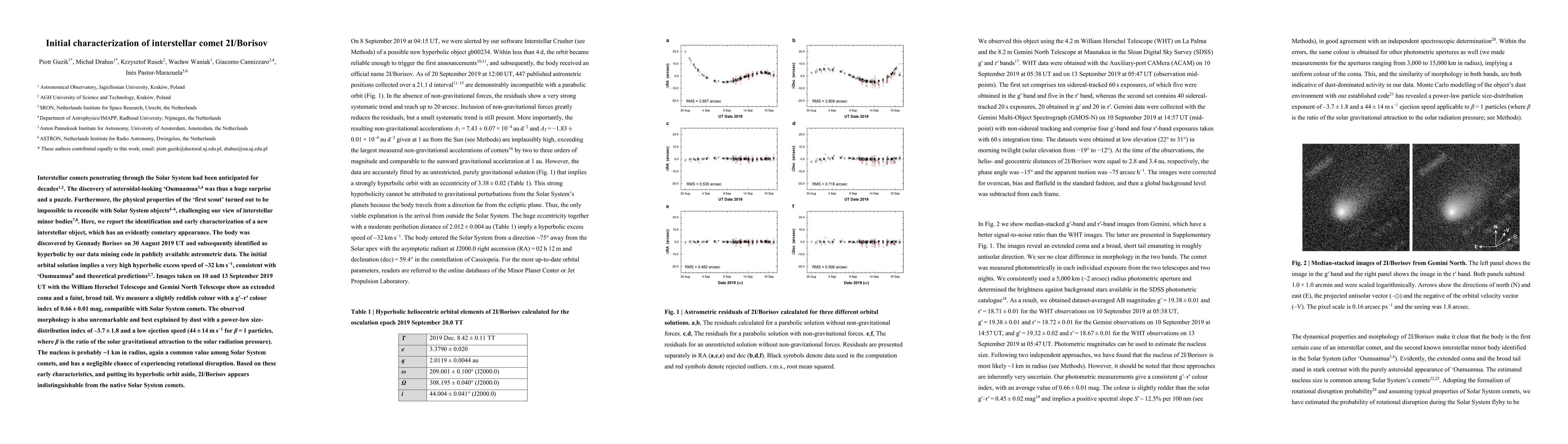 Interstellar comets penetrating through the Solar System had been anticipated for decades. The discovery of asteroidal-looking 'Oumuamua was thus a huge surprise and a puzzle. Furthermore, the physical properties of the 'first scout' turned out to be impossible to reconcile with Solar System objects, challenging our view of interstellar minor bodies. Here, we report the identification and early characterization of a new interstellar object, which has an evidently cometary appearance. The body was discovered by Gennady Borisov on 30 August 2019 UT and subsequently identified as hyperbolic by our data mining code in publicly available astrometric data. The initial orbital solution implies a very high hyperbolic excess speed of ~32 km/s, consistent with 'Oumuamua and theoretical predictions. Images taken on 10 and 13 September 2019 UT with the William Herschel Telescope and Gemini North Telescope show an extended coma and a faint, broad tail. We measure a slightly reddish colour with a g'-r' colour index of 0.66 +/- 0.01 mag, compatible with Solar System comets. The observed morphology is also unremarkable and best explained by dust with a power-law size-distribution index of -3.7 +/- 1.8 and a low ejection speed (44 +/- 14 m/s for $\beta$ = 1 particles, where $\beta$ is the ratio of the solar gravitational attraction to the solar radiation pressure). The nucleus is probably ~1 km in radius, again a common value among Solar System comets, and has a negligible chance of experiencing rotational disruption. Based on these early characteristics, and putting its hyperbolic orbit aside, 2I/Borisov appears indistinguishable from the native Solar System comets.