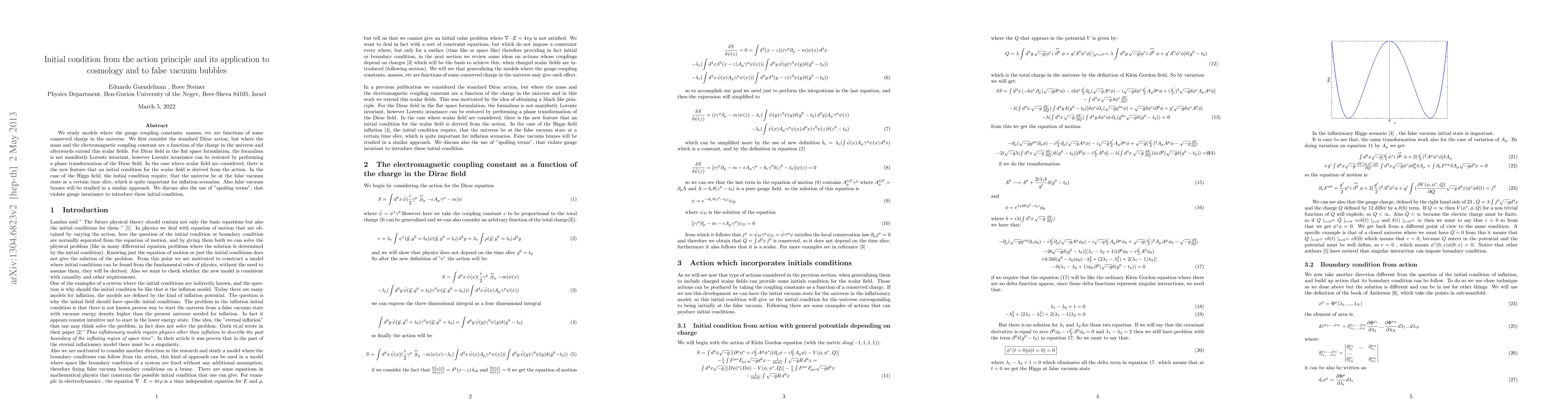 We study models where the gauge coupling constants, masses, etc are functions of some conserved charge in the universe. We first consider the standard Dirac action, but where the mass and the electromagnetic coupling constant are a function of the charge in the universe and afterwards extend this scalar fields. For Dirac field in the flat space formulation, the formalism is not manifestly Lorentz invariant, however Lorentz invariance can be restored by performing a phase transformation of the Dirac field. In the case where scalar field are considered, there is the new feature that an initial condition for the scalar field is derived from the action. In the case of the Higgs field, the initial condition require, that the universe be at the false vacuum state at a certain time slice, which is quite important for inflation scenarios. Also false vacuum branes will be studied in a similar approach. We discuss also the use of "spoiling terms", that violate gauge invariant to introduce these initial condition.