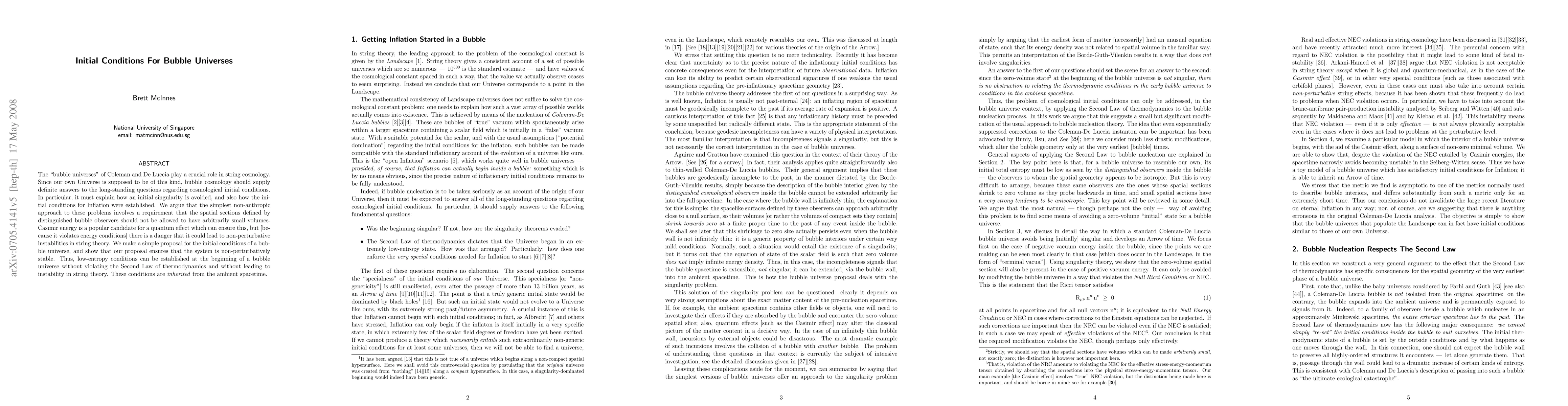 This paper explores initial conditions for bubble universes in string cosmology, proposing that spatial sections of bubble observers should not have arbitrarily small volumes to avoid singularities and establish Inflation's initial conditions. The authors suggest that Casimir energy, while a candidate, can lead to instabilities, and propose a non-perturbatively stable alternative ensuring low-entropy conditions without violating thermodynamic laws or string theory stability.