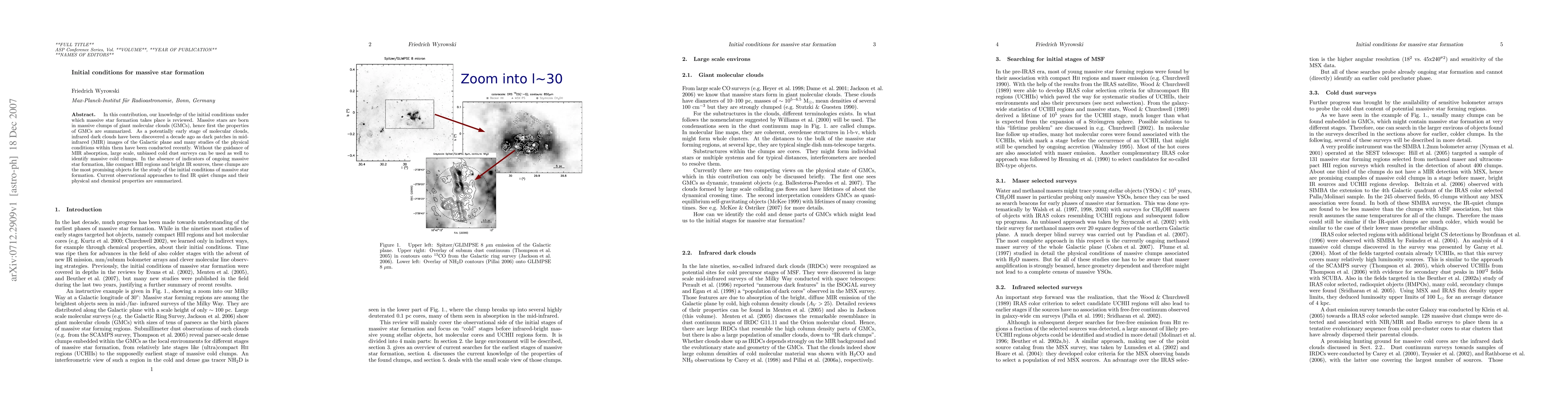 This paper reviews the initial conditions for massive star formation, focusing on the properties of massive clumps within giant molecular clouds (GMCs) and infrared dark clouds, which are potential early stages of these clouds. It discusses observational methods to identify cold, IR-quiet clumps that may indicate the beginnings of massive star formation.