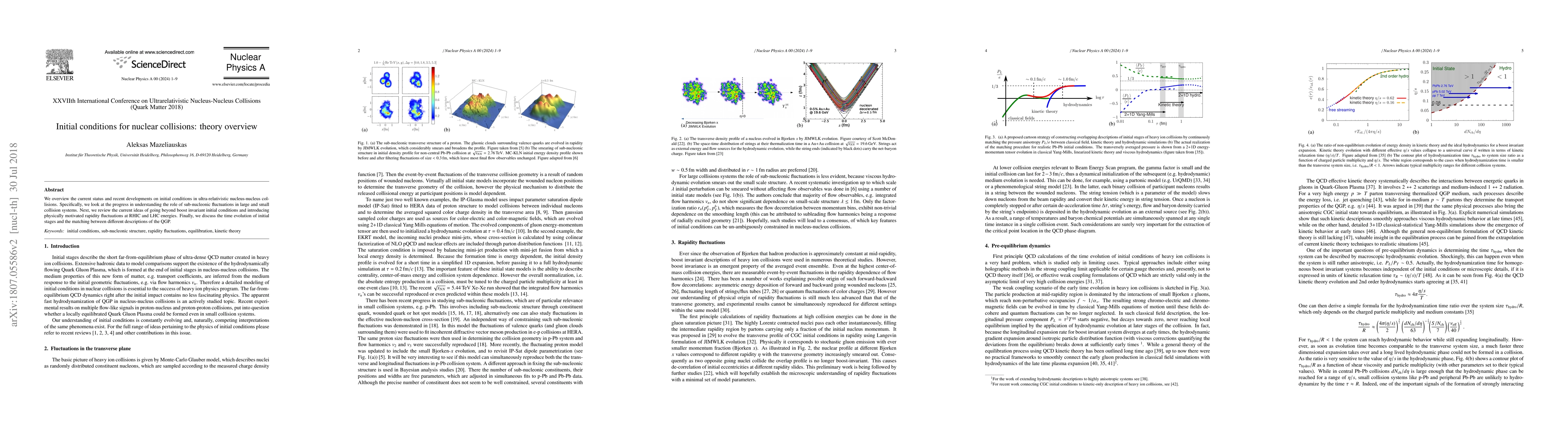 We overview the current status and recent developments on initial conditions in ultra-relativistic nucleus-nucleus collisions. Specifically, we look at the progress in understanding the role of sub-nucleonic fluctuations in large and small collision systems. Next, we review the current ideas of going beyond boost invariant initial conditions and introducing physically motivated rapidity fluctuations at RHIC and LHC energies. Finally, we discuss the time evolution of initial stages and the matching between different descriptions of the QGP.