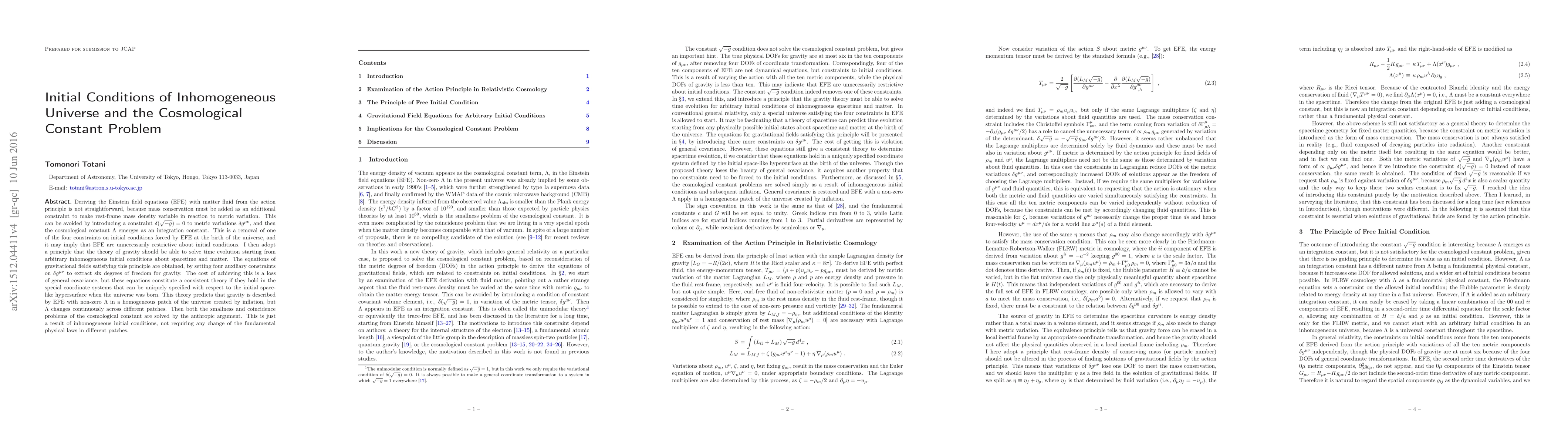 Deriving the Einstein field equations (EFE) with matter fluid from the action principle is not straightforward, because mass conservation must be added as an additional constraint to make rest-frame mass density variable in reaction to metric variation. This can be avoided by introducing a constraint $\delta(\sqrt{-g}) = 0$ to metric variations $\delta g^{\mu\nu}$, and then the cosmological constant $\Lambda$ emerges as an integration constant. This is a removal of one of the four constraints on initial conditions forced by EFE at the birth of the universe, and it may imply that EFE are unnecessarily restrictive about initial conditions. I then adopt a principle that the theory of gravity should be able to solve time evolution starting from arbitrary inhomogeneous initial conditions about spacetime and matter. The equations of gravitational fields satisfying this principle are obtained, by setting four auxiliary constraints on $\delta g^{\mu\nu}$ to extract six degrees of freedom for gravity. The cost of achieving this is a loss of general covariance, but these equations constitute a consistent theory if they hold in the special coordinate systems that can be uniquely specified with respect to the initial space-like hypersurface when the universe was born. This theory predicts that gravity is described by EFE with non-zero $\Lambda$ in a homogeneous patch of the universe created by inflation, but $\Lambda$ changes continuously across different patches. Then both the smallness and coincidence problems of the cosmological constant are solved by the anthropic argument. This is just a result of inhomogeneous initial conditions, not requiring any change of the fundamental physical laws in different patches.