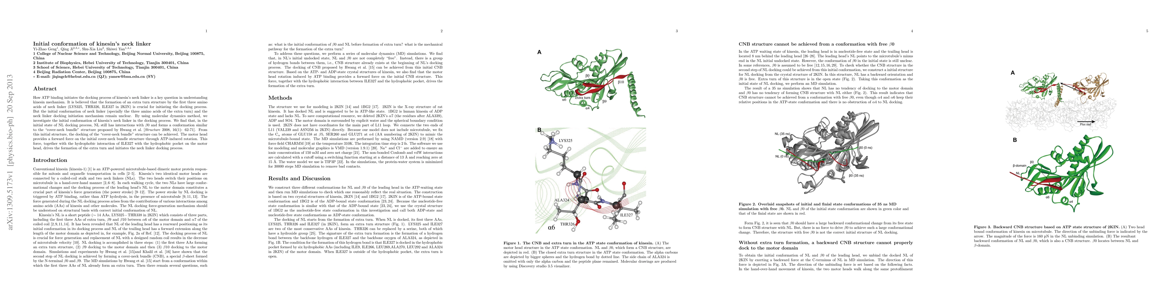 This paper investigates the initial conformation of kinesin's neck linker (NL) using molecular dynamics, revealing that NL initially interacts with {\beta}0 in a "cover-neck bundle" structure. The docking process is initiated by ATP-induced rotation and a forward force from the motor head, facilitated by hydrophobic interactions of ILE327.