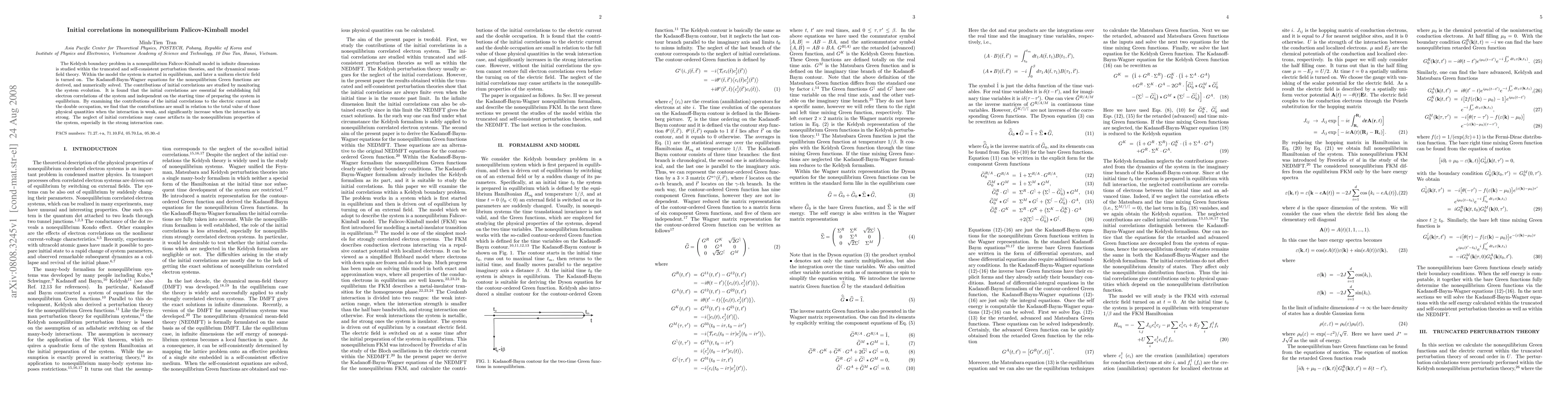 The Keldysh boundary problem in a nonequilibrium Falicov-Kimball model in infinite dimensions is studied within the truncated and self-consistent perturbation theories, and the dynamical mean-field theory. Within the model the system is started in equilibrium, and later a uniform electric field is turned on. The Kadanoff-Baym-Wagner equations for the nonequilibrium Green functions are derived, and numerically solved. The contributions of initial correlations are studied by monitoring the system evolution. It is found that the initial correlations are essential for establishing full electron correlations of the system and independent on the starting time of preparing the system in equilibrium. By examining the contributions of the initial correlations to the electric current and the double occupation, we find that the contributions are small in relation to the total value of those physical quantities when the interaction is weak, and significantly increase when the interaction is strong. The neglect of initial correlations may cause artifacts in the nonequilibrium properties of the system, especially in the strong interaction case.
