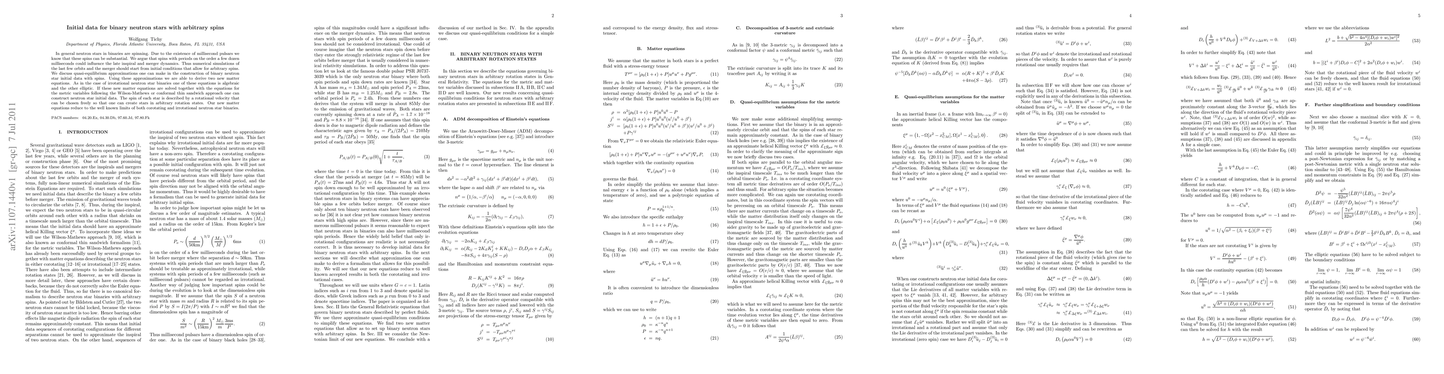 This paper presents methods for constructing initial data for binary neutron star simulations that account for arbitrary spin states, crucial for understanding the dynamics of neutron stars with millisecond pulsar spins. The authors derive new matter equations that generalize existing approaches, enabling the creation of neutron stars in any rotational state.