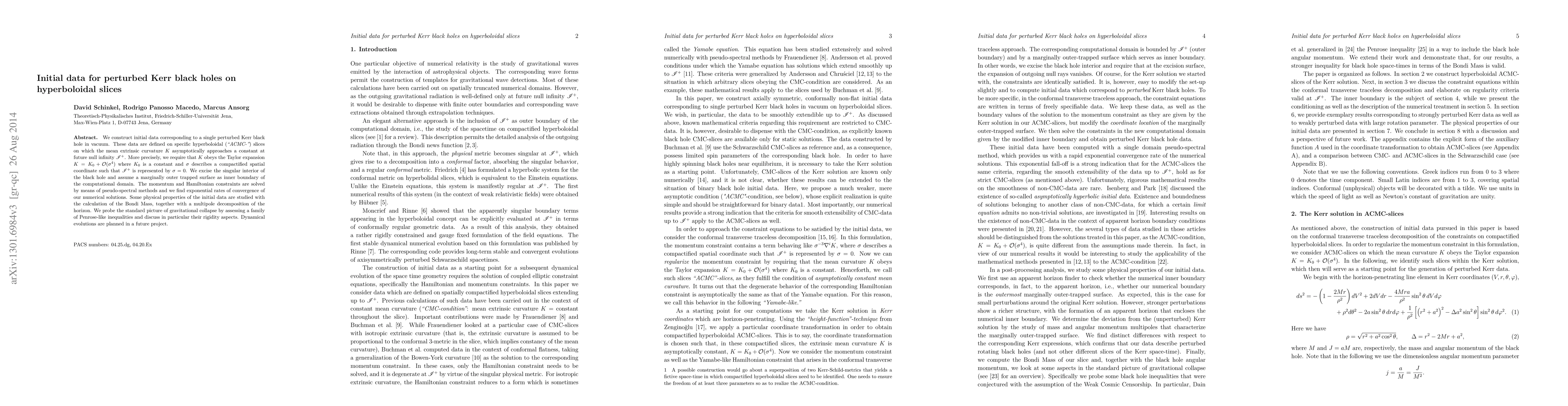 We construct initial data corresponding to a single perturbed Kerr black hole in vacuum. These data are defined on specific hyperboloidal ("ACMC-") slices on which the mean extrinsic curvature K asymptotically approaches a constant at future null infinity scri+. More precisely, we require that K obeys the Taylor expansion K=K0 + s^4 where K0 is a constant and s describes a compactified spatial coordinate such that scri+ is represented by s=0. We excise the singular interior of the black hole and assume a marginally outer trapped surface as inner boundary of the computational domain. The momentum and Hamiltonian constraints are solved by means of pseudo-spectral methods and we find exponential rates of convergence of our numerical solutions. Some physical properties of the initial data are studied with the calculation of the Bondi Mass, together with a multipole decomposition of the horizon. We probe the standard picture of gravitational collapse by assessing a family of Penrose-like inequalities and discuss in particular their rigidity aspects. Dynamical evolutions are planned in a future project.