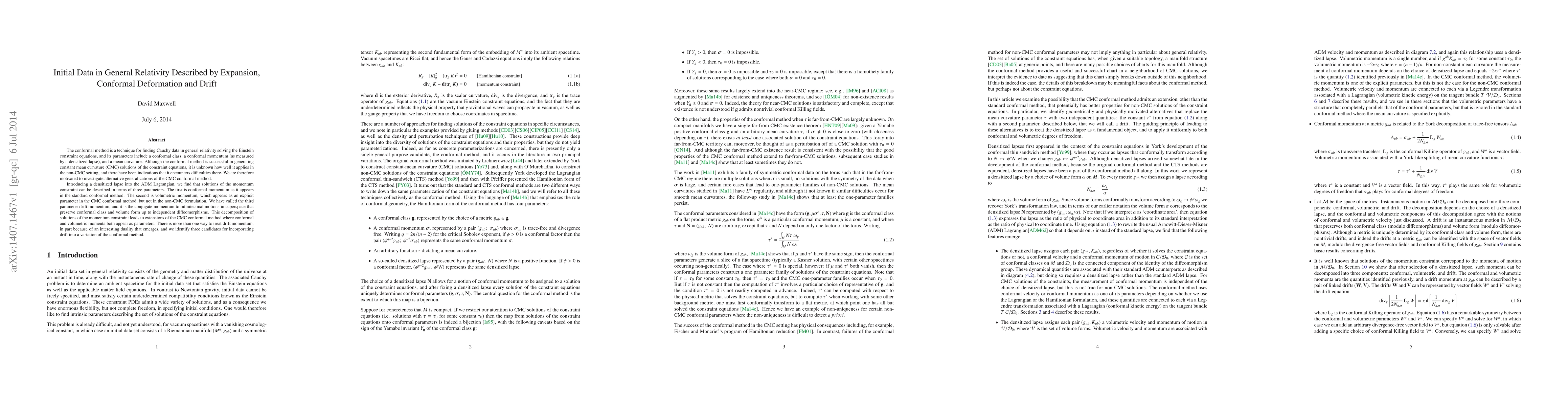 The conformal method is a technique for finding Cauchy data in general relativity solving the Einstein constraint equations, and its parameters include a conformal class, a conformal momentum (as measured by a densitized lapse), and a mean curvature. Although the conformal method is successful in generating constant mean curvature (CMC) solutions of the constraint equations, it is unknown how well it applies in the non-CMC setting, and there have been indications that it encounters difficulties there. We are therefore motivated to investigate alternative generalizations of the CMC conformal method. Introducing a densitized lapse into the ADM Lagrangian, we find that solutions of the momentum constraint can be described in terms of three parameters. The first is conformal momentum as it appears in the standard conformal method. The second is volumetric momentum, which appears as an explicit parameter in the CMC conformal method, but not in the non-CMC formulation. We have called the third parameter drift momentum, and it is the conjugate momentum to infinitesimal motions in superspace that preserve conformal class and volume form up to independent diffeomorphisms. This decomposition of solutions of the momentum constraint leads to extensions of the CMC conformal method where conformal and volumetric momenta both appear as parameters. There is more than one way to treat drift momentum, in part because of an interesting duality that emerges, and we identify three candidates for incorporating drift into a variation of the conformal method.