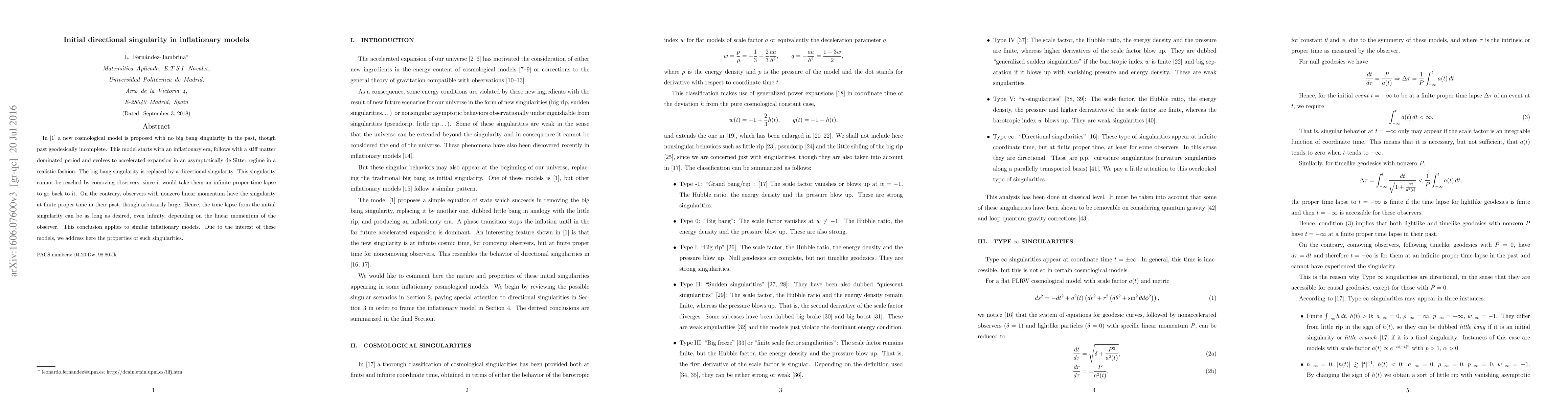 In [1] a new cosmological model is proposed with no big bang singularity in the past, though past geodesically incomplete. This model starts with an inflationary era, follows with a stiff matter dominated period and evolves to accelerated expansion in an asymptotically de Sitter regime in a realistic fashion. The big bang singularity is replaced by a directional singularity. This singularity cannot be reached by comoving observers, since it would take them an infinite proper time lapse to go back to it. On the contrary, observers with nonzero linear momentum have the singularity at finite proper time in their past, though arbitrarily large. Hence, the time lapse from the initial singularity can be as long as desired, even infinity, depending on the linear momentum of the observer. This conclusion applies to similar inflationary models. Due to the interest of these models, we address here the properties of such singularities.