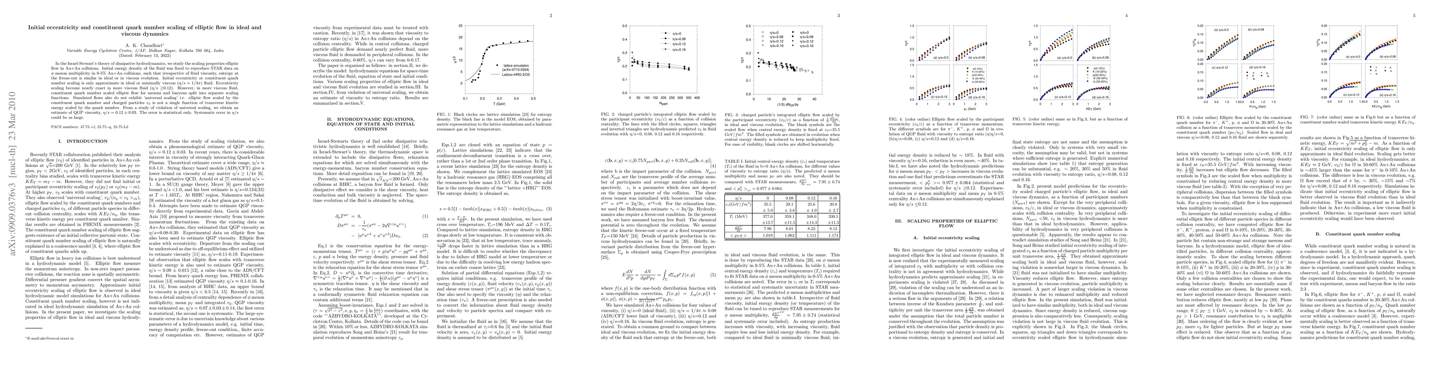 This paper investigates elliptic flow scaling in Au+Au collisions using Israel-Stewart's dissipative hydrodynamics, finding that initial eccentricity scaling is nearly exact in more viscous fluids but constituent quark number scaling splits for mesons and baryons. The study estimates the QGP viscosity as $\eta/s=0.12 \pm 0.03$.