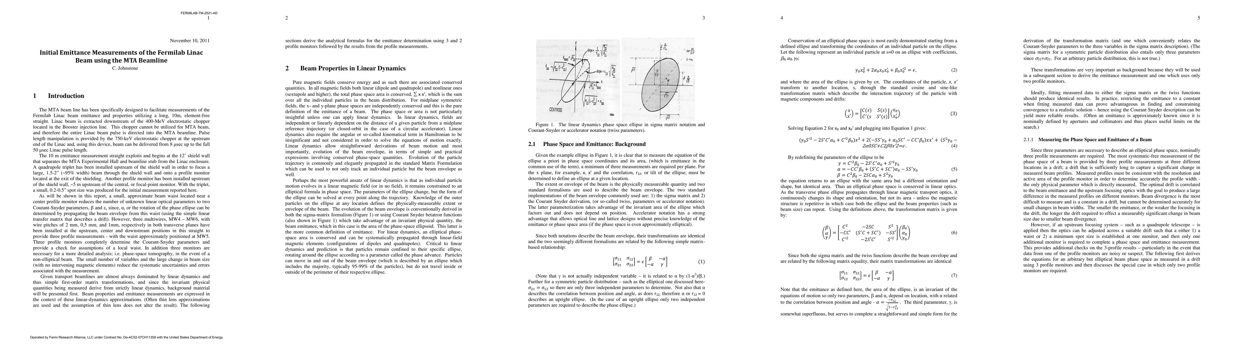 The MTA beam line has been specifically designed to facilitate measurements of the Fermilab Linac beam emittance and properties utilizing a long, 10m, element-free straight. Linac beam is extracted downstream of the 400-MeV electrostatic chopper located in the Booster injection line. This chopper cannot be utilized for MTA beam, and therefore the entire Linac beam pulse is directed into the MTA beamline. Pulse length manipulation is provided by the 750-keV electrostatic chopper at the upstream end of the Linac and, using this device, beam can be delivered from 8 {\mu}sec up to the full 50 {\mu}sec Linac pulse length. The 10 m emittance measurement straight exploits and begins at the 12' shield wall that separates the MTA Experimental Hall and beamline stub from the Linac enclosure. A quadrupole triplet has been installed upstream of the shield wall in order to focus a large, 1.5-2" (~95% width) beam through the shield wall and onto a profile monitor located at the exit of the shielding. Another profile monitor has been installed upstream of the shield wall, ~5 m upstream of the central, or focal-point monitor. With the triplet, a small, 0.2-0.5" spot size was produced for the initial measurement reported here. As will be shown in this report, a small, approximate beam waist located near a center profile monitor reduces the number of unknown linear optical parameters to two Courant-Snyder parameters, {\beta} and {\epsilon}, since, {\alpha}, or the rotation of the phase ellipse can be determined by propagating the beam envelope from this waist (using the simple linear transfer matrix that describes a drift).