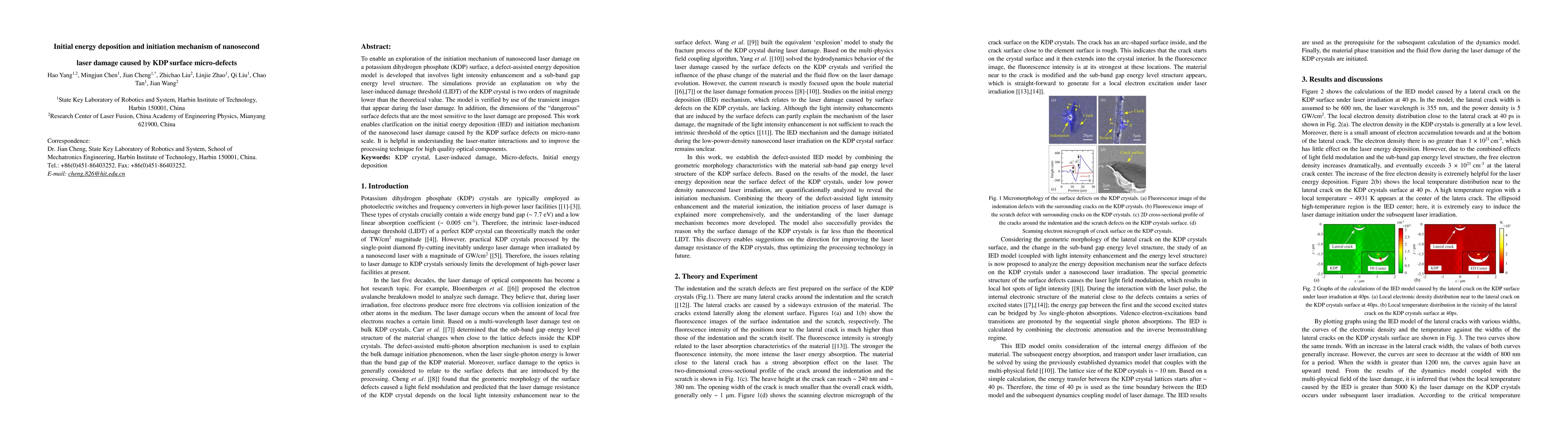This paper develops a defect-assisted energy deposition model to explain the initiation mechanism of nanosecond laser damage on KDP surfaces, revealing why the laser-induced damage threshold is much lower than expected. The model is validated through transient imaging and identifies the critical dimensions of surface defects that contribute to laser damage.