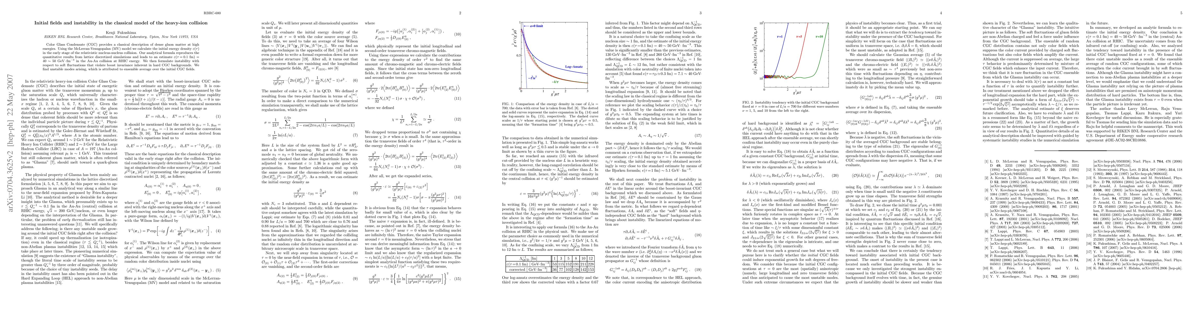 Color Glass Condensate (CGC) provides a classical description of dense gluon matter at high energies. Using the McLerran-Venugopalan (MV) model we calculate the initial energy density \epsilon(\tau) in the early stage of the relativistic nucleus-nucleus collision. Our analytical formula reproduces the quantitative results from lattice discretized simulations and leads to an estimate \epsilon(\tau=0.1fm)=40-50GeV/fm^3 in the Au-Au collision at RHIC energy. We then formulate instability with respect to soft fluctuations that violate boost invariance inherent to hard CGC backgrounds. We find unstable modes arising as a result of ensemble average over the initial CGC fields.