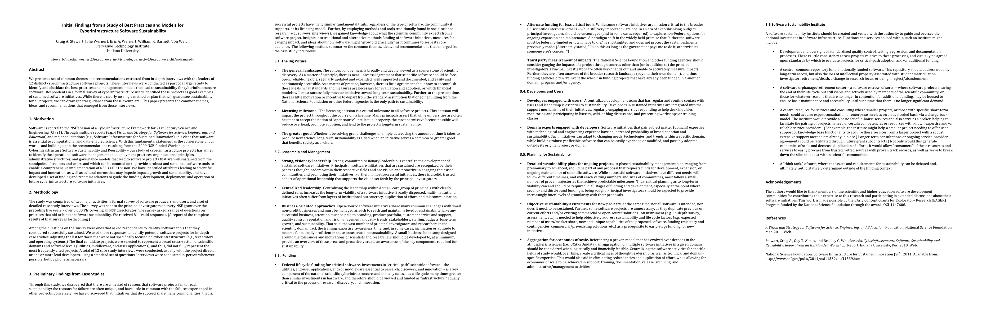 This study identifies best practices and management models for cyberinfrastructure software sustainability through in-depth interviews with leaders of 12 exemplary projects. The findings provide general guidance on themes and recommendations for sustaining software initiatives.