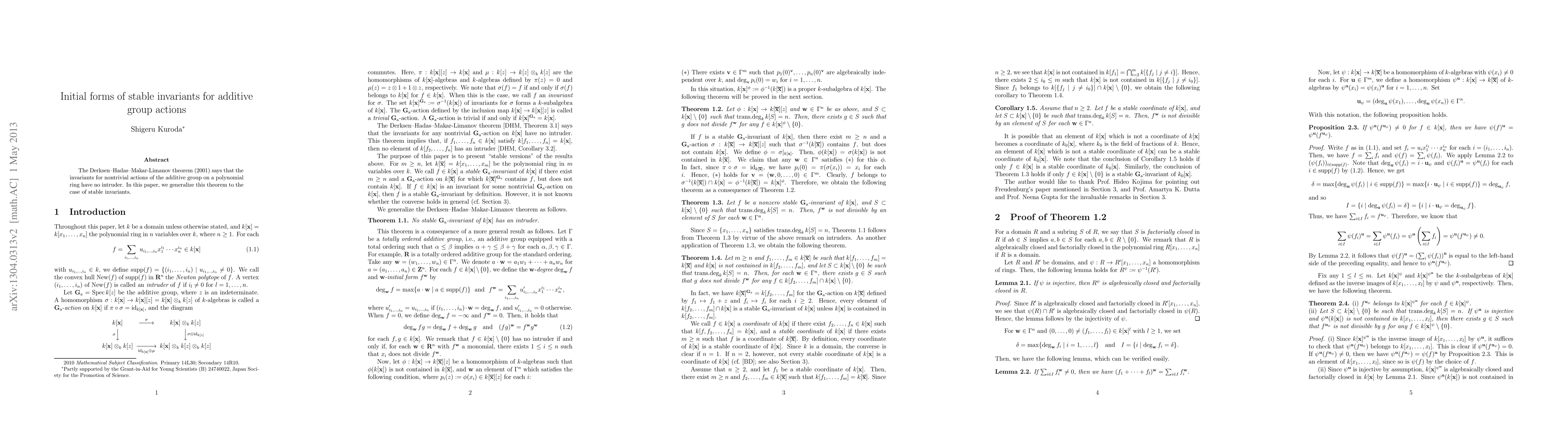 Summary: This paper extends the Derksen--Hadas--Makar-Limanov theorem to stable invariants, confirming that nontrivial actions of the additive group on a polynomial ring do not introduce any "intruder" invariants. The focus is on establishing initial forms of these stable invariants.
