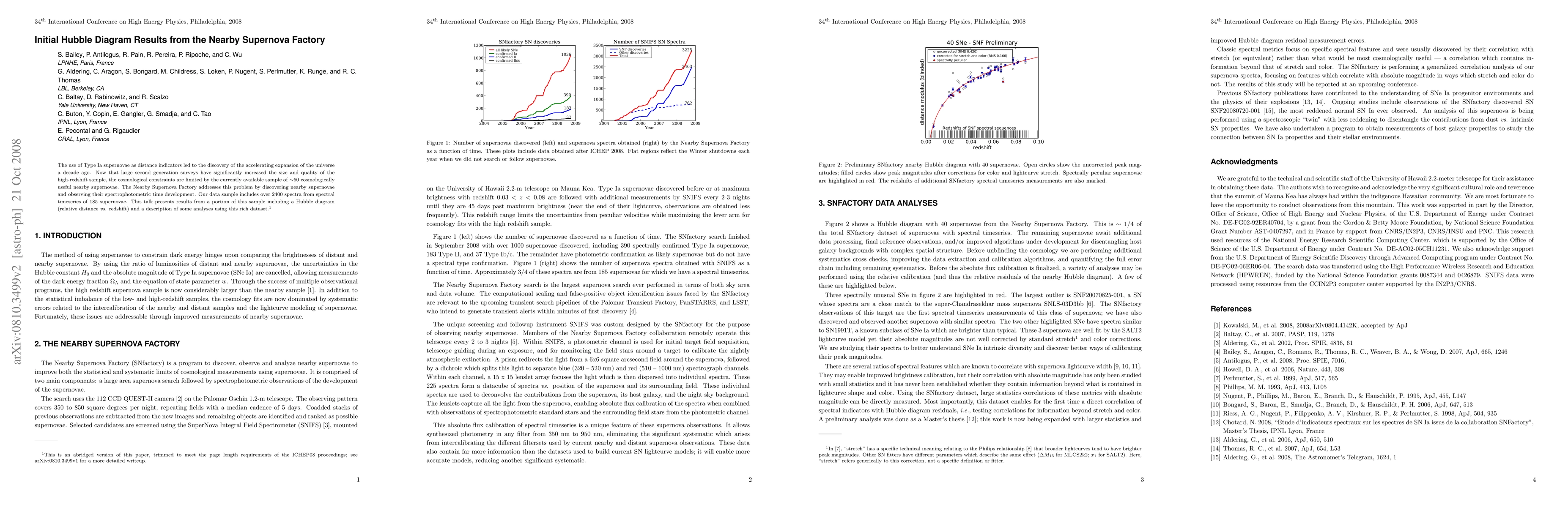 The use of Type Ia supernovae as distance indicators led to the discovery of the accelerating expansion of the universe a decade ago. Now that large second generation surveys have significantly increased the size and quality of the high-redshift sample, the cosmological constraints are limited by the currently available sample of ~50 cosmologically useful nearby supernovae. The Nearby Supernova Factory addresses this problem by discovering nearby supernovae and observing their spectrophotometric time development. Our data sample includes over 2400 spectra from spectral timeseries of 185 supernovae. This talk presents results from a portion of this sample including a Hubble diagram (relative distance vs. redshift) and a description of some analyses using this rich dataset.