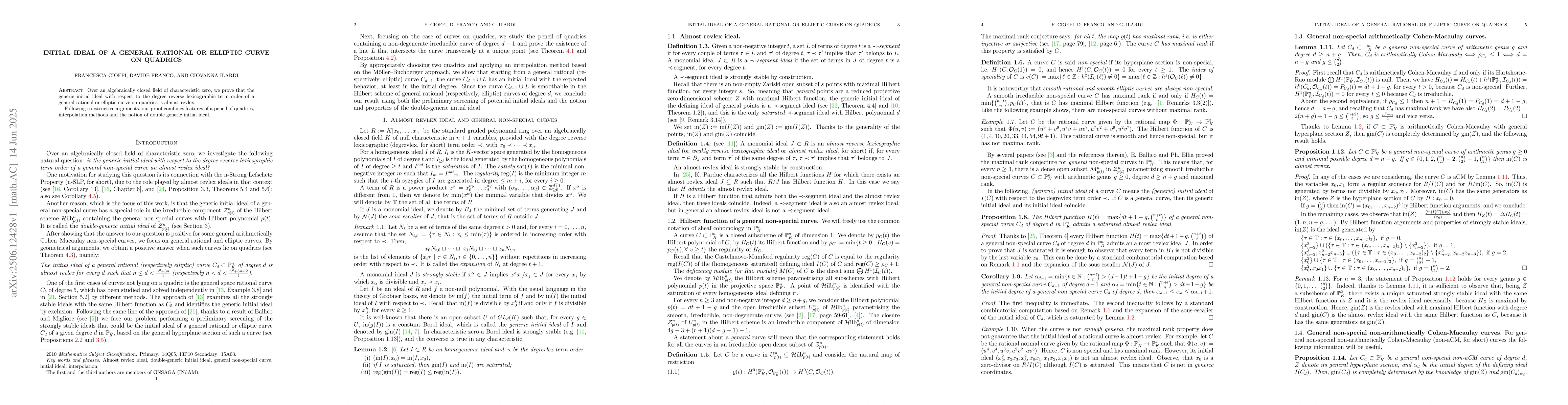 Over an algebraically closed field of characteristic zero, we prove that the generic initial ideal with respect to the degree reverse lexicographic term order of a general rational or elliptic curve on quadrics is almost revlex. Following constructive arguments, our proof combines features of a pencil of quadrics, interpolation methods and the notion of double generic initial ideal.