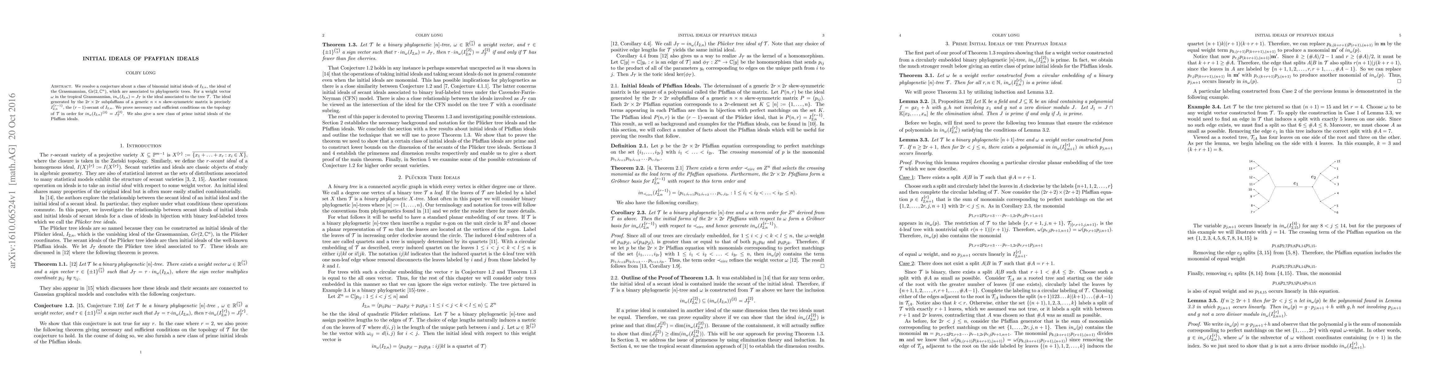 This paper resolves a conjecture about binomial initial ideals of $I_{2,n}$, the Grassmannian ideal, associated with phylogenetic trees. It proves conditions on the topology of trees for the initial ideal of the $(r-1)$-secant of $I_{2,n}$ to match the ideal associated with the tree, and introduces a new class of prime initial ideals of Pfaffian ideals.