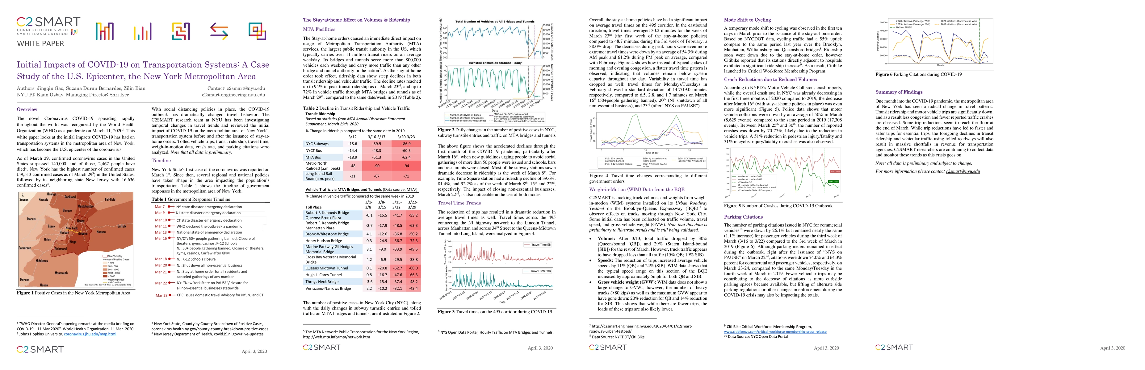 The novel Coronavirus COVID-19 spreading rapidly throughout the world was recognized by the World Health Organization (WHO) as a pandemic on March 11, 2020. One month into the COVID-19 pandemic, this white paper looks at the initial impacts COVID-19 has had on transportation systems in the metropolitan area of New York, which has become the U.S. epicenter of the coronavirus.