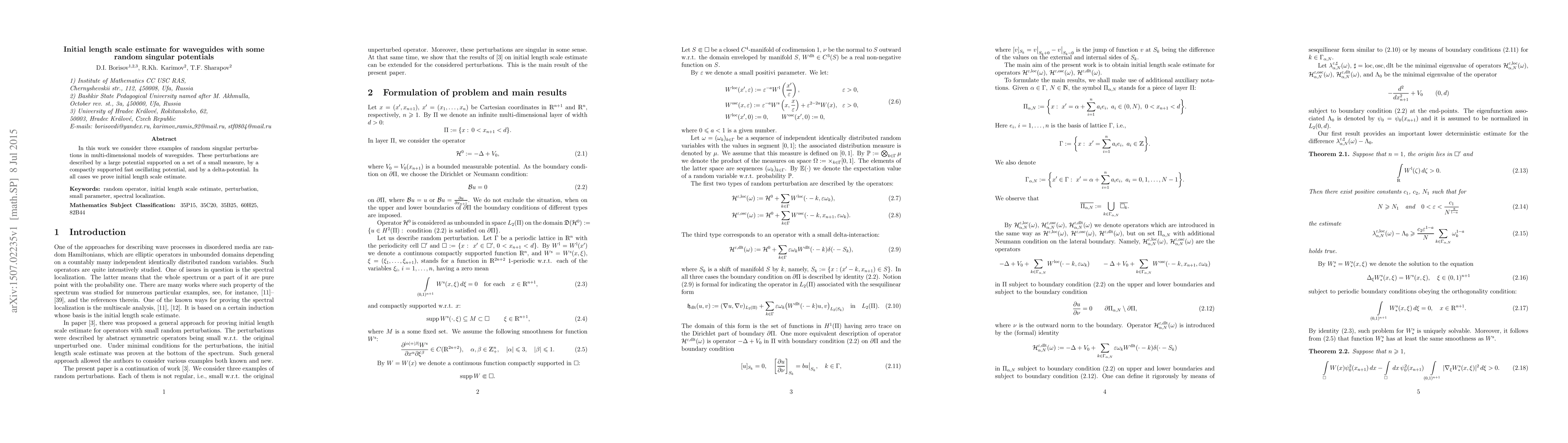 In this work we consider three examples of random singular perturbations in multi-dimensional models of waveguides. These perturbations are described by a large potential supported on a set of a small measure, by a compactly supported fast oscillating potential, and by a delta-potential. In all cases we prove initial length scale estimate.