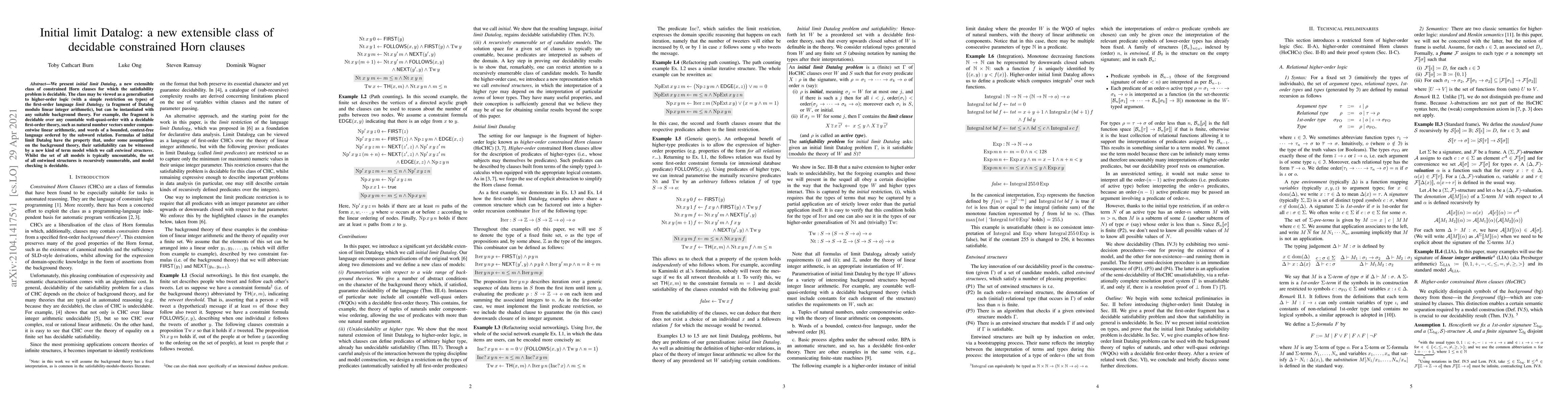 We present initial limit Datalog, a new extensible class of constrained Horn clauses for which the satisfiability problem is decidable. The class may be viewed as a generalisation to higher-order logic (with a simple restriction on types) of the first-order language limit Datalog$_Z$ (a fragment of Datalog modulo linear integer arithmetic), but can be instantiated with any suitable background theory. For example, the fragment is decidable over any countable well-quasi-order with a decidable first-order theory, such as natural number vectors under componentwise linear arithmetic, and words of a bounded, context-free language ordered by the subword relation. Formulas of initial limit Datalog have the property that, under some assumptions on the background theory, their satisfiability can be witnessed by a new kind of term model which we call entwined structures. Whilst the set of all models is typically uncountable, the set of all entwined structures is recursively enumerable, and model checking is decidable.
