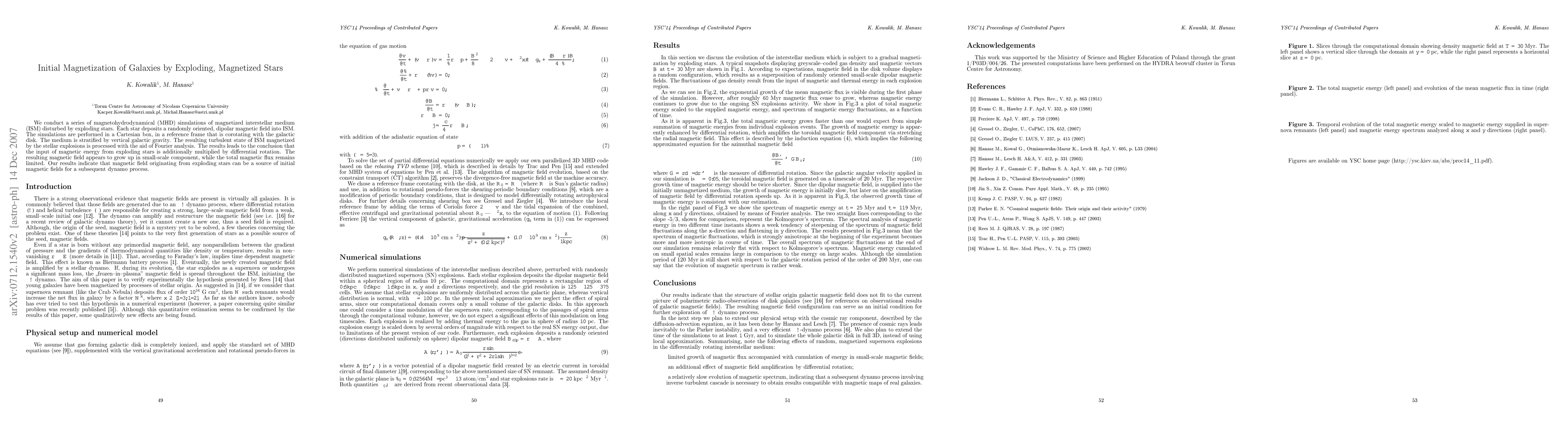 This paper uses magnetohydrodynamical simulations to explore how exploding, magnetized stars contribute to the initial magnetization of galaxies. The study finds that differential rotation amplifies the magnetic energy from these stellar explosions, leading to a growth in small-scale magnetic fields while keeping the total magnetic flux limited, suggesting a potential source for subsequent dynamo processes.