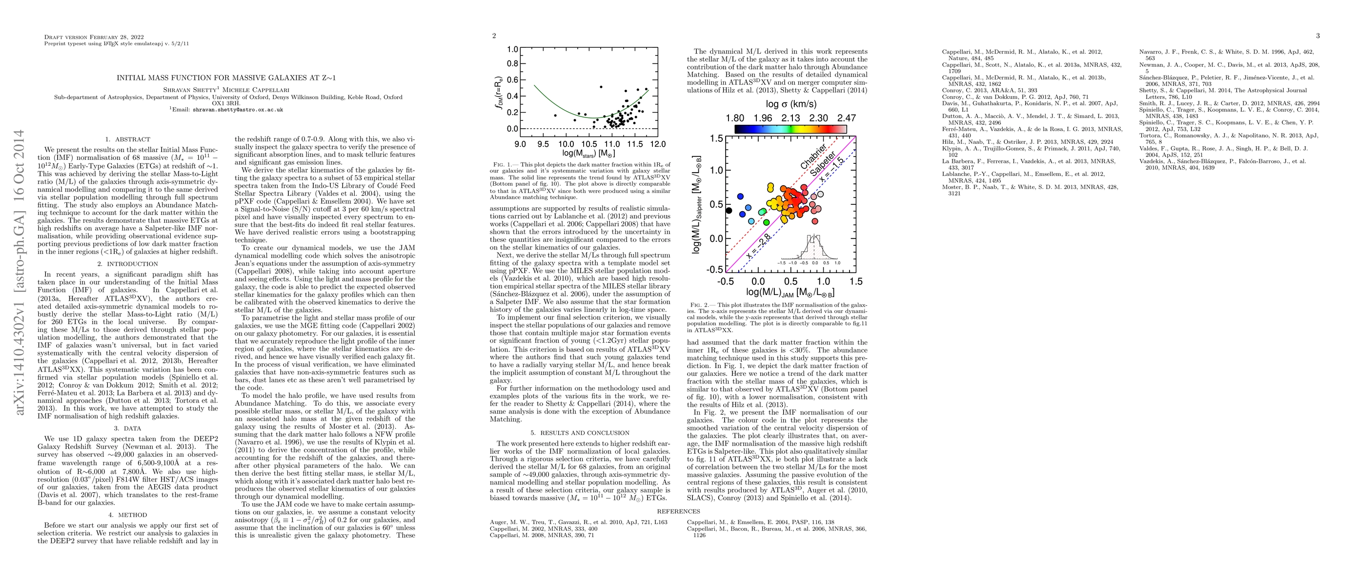 We present the results on the stellar Initial Mass Function (IMF) normalisation of 68 massive ($M_\ast=10^{11}-10^{12}$$M_\odot$) Early-Type Galaxies (ETGs) at redshift of $\sim$1. This was achieved by deriving the stellar Mass-to-Light ratio (M/L) of the galaxies through axis-symmetric dynamical modelling and comparing it to the same derived via stellar population modelling through full spectrum fitting. The study also employs an Abundance Matching technique to account for the dark matter within the galaxies. The results demonstrate that massive ETGs at high redshifts on average have a Salpeter-like IMF normalisation, while providing observational evidence supporting previous predictions of low dark matter fraction in the inner regions ($\lesssim$ 1R$_{\rm e}$) of galaxies at higher redshift.