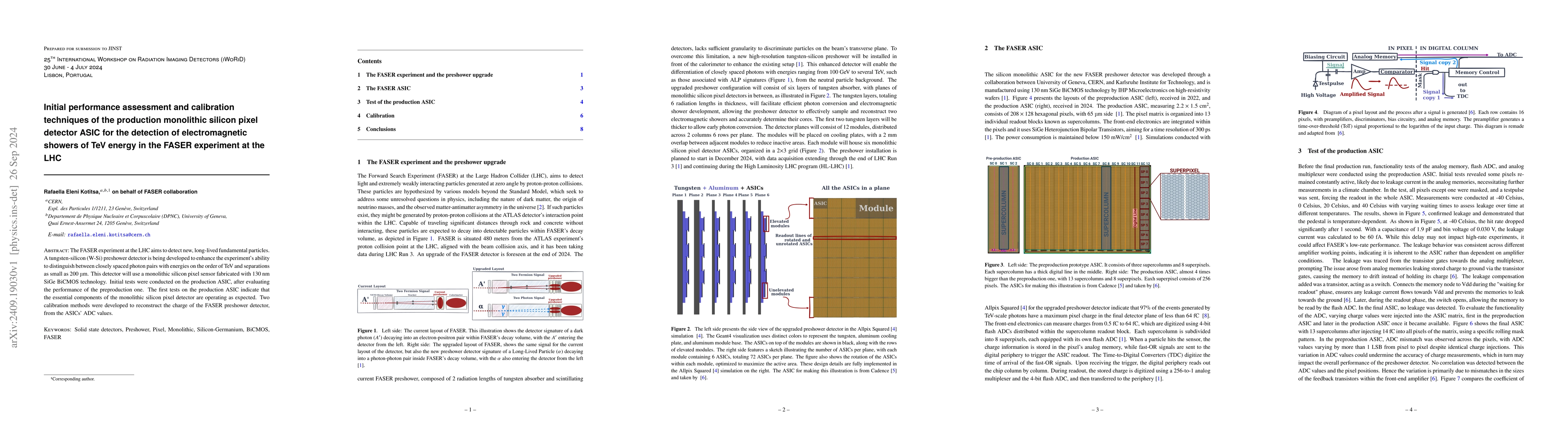 The FASER experiment at the LHC aims to detect new, long-lived fundamental particles. A tungsten-silicon (W-Si) preshower detector is being developed to enhance the experiment's ability to distinguish between closely spaced photon pairs with energies on the order of TeV and separations as small as 200 \textmu m. This detector will use a monolithic silicon pixel sensor fabricated with 130 nm SiGe BiCMOS technology. Initial tests were conducted on the production ASIC, after evaluating the performance of the preproduction one. The first tests on the production ASIC indicate that the essential components of the monolithic silicon pixel detector are operating as expected. Two calibration methods were developed to reconstruct the charge of the FASER preshower detector, from the ASICs' ADC values.