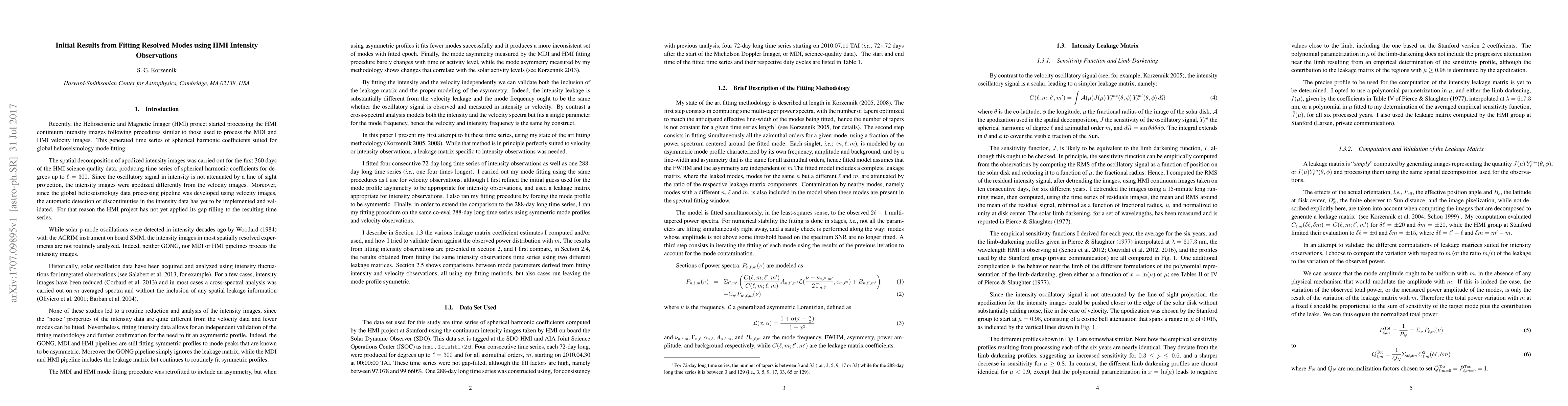 The HMI project recently started processing the continuum intensity images following global helioseismology procedures similar to those used to process the velocity images. The spatial decomposition of these images has produced time series of spherical harmonic coefficients for degrees up to $\ell=300$, using a different apodization than the one used for velocity observations. The first 360 days of observations were processed and made available. In this paper I present initial results from fitting these time series using my state of the art fitting methodology and compare the derived mode characteristics to those estimated using co-eval velocity observations.