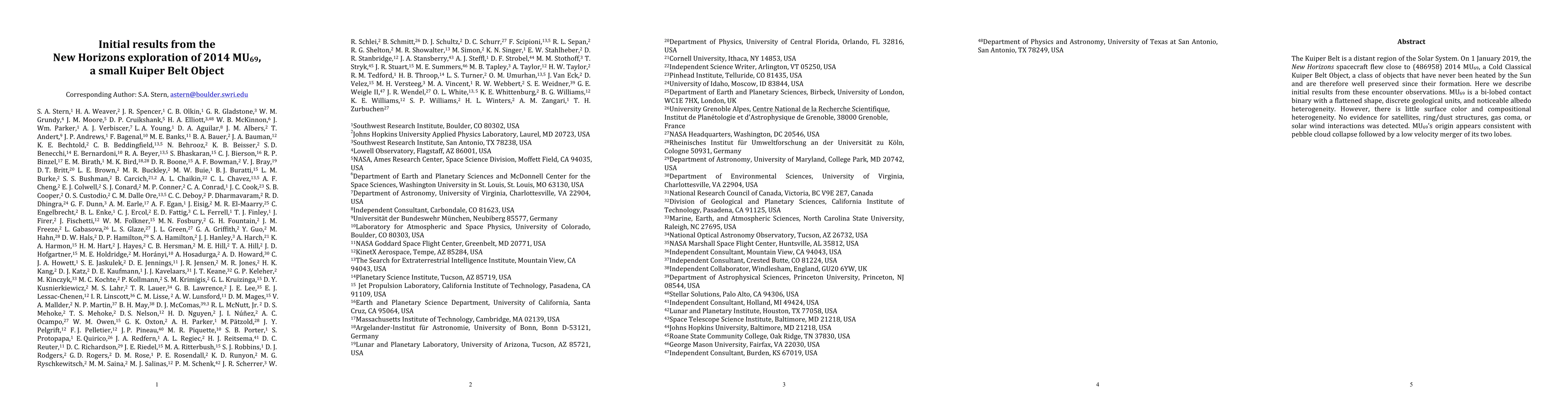 The New Horizons spacecraft observed a small Kuiper Belt Object, 2014 MU69, revealing a bi-lobed contact binary with preserved geological features, but no satellites, rings, or solar wind interactions detected.