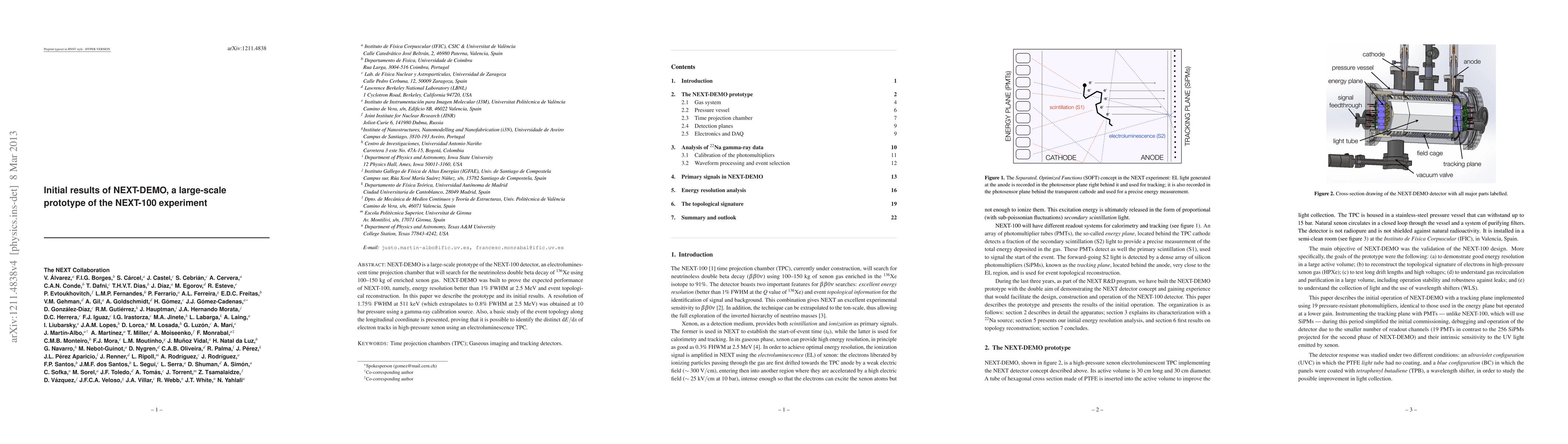 NEXT-DEMO is a large-scale prototype of the NEXT-100 detector, an electroluminescent time projection chamber that will search for the neutrinoless double beta decay of Xe-136 using 100 to 150 kg of enriched xenon gas. NEXT-DEMO was built to prove the expected performance of NEXT-100, namely, energy resolution better than 1% FWHM at 2.5 MeV and event topological reconstruction. In this paper we describe the prototype and its initial results. A resolution of 1.75% FWHM at 511 keV (which extrapolates to 0.8% FWHM at 2.5 MeV) was obtained at 10 bar pressure using a gamma-ray calibration source. Also, a basic study of the event topology along the longitudinal coordinate is presented, proving that it is possible to identify the distinct dE/dx of electron tracks in high-pressure xenon using an electroluminescence TPC.