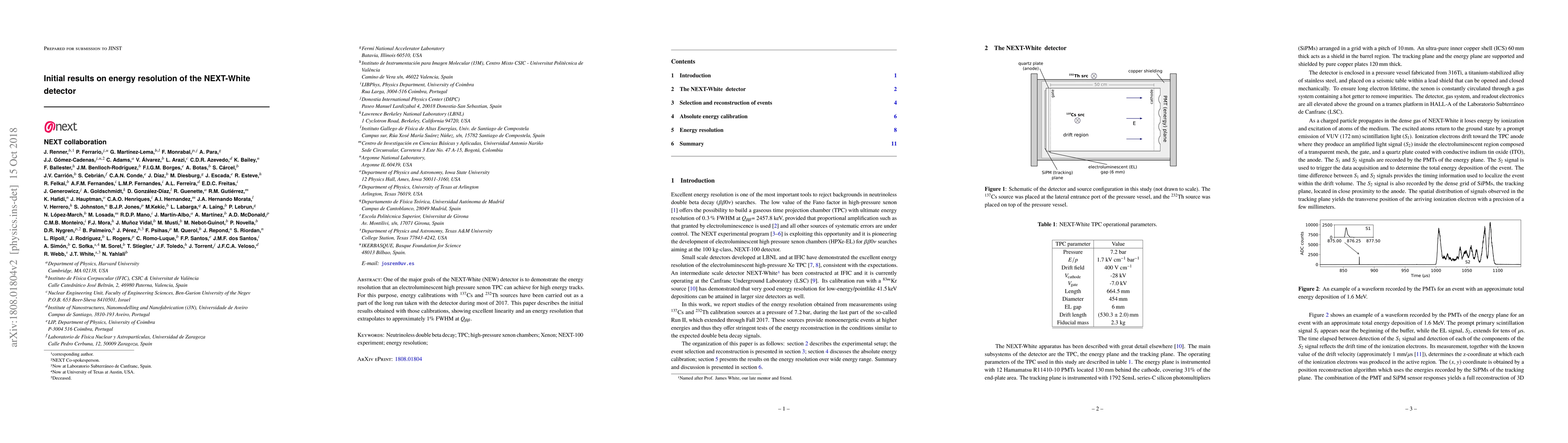 This paper reports initial results from the NEXT-White detector, showcasing excellent linearity and an energy resolution of approximately 1% FWHM at Q$_{\beta\beta}$ through calibrations using 137Cs and 232Th sources. These findings highlight the detector's potential for high-energy track measurements.