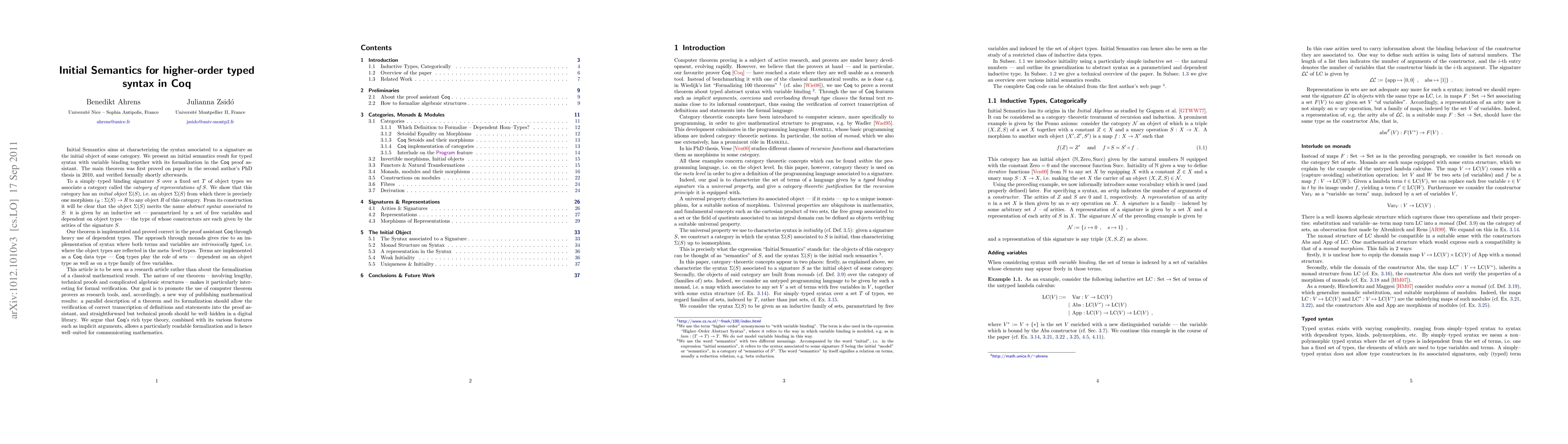This paper presents an initial semantics for higher-order typed syntax and its formalization in Coq, focusing on the construction of an abstract syntax object Sigma(S) for a simply-typed binding signature S. The formalization emphasizes Coq's rich type theory to ensure clear and readable proofs, advocating for computer theorem provers as effective research tools.