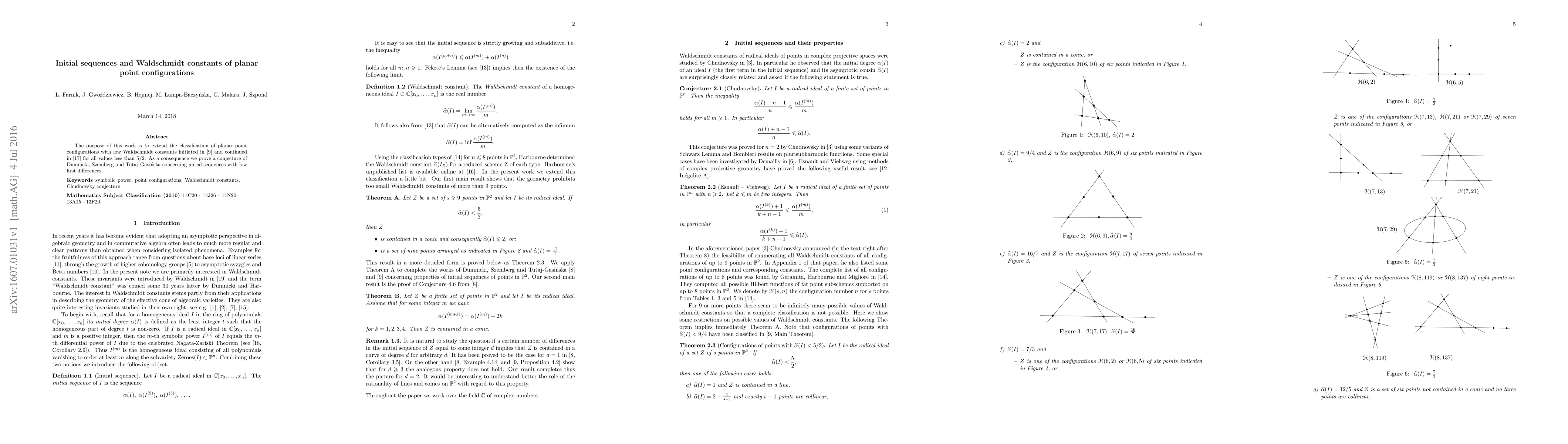 The purpose of this work is to extend the classification of planar point configurations with low Waldschmidt constants for all values less than $5/2$. As a consequence we prove a conjecture of Dumnicki, Szemberg and Tutaj-Gasi\'nska concerning initial sequences with low first differences.