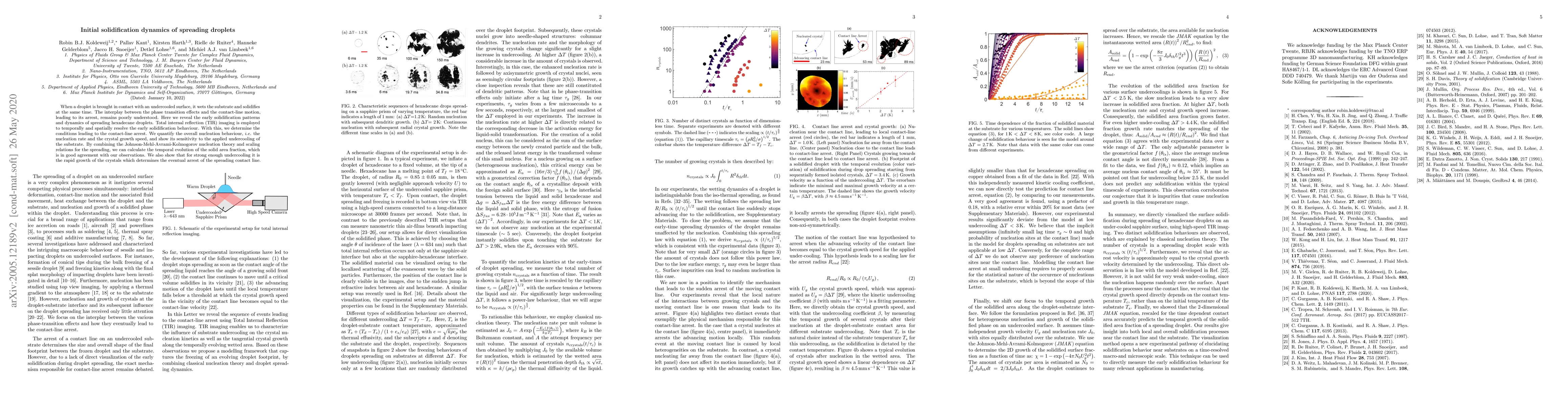 When a droplet is brought in contact with an undercooled surface, it wets the substrate and solidifies at the same time. The interplay between the phase transition effects and the contact-line motion, leading to its arrest, remains poorly understood. Here we reveal the early solidification patterns and dynamics of spreading hexadecane droplets. Total internal reflection (TIR) imaging is employed to temporally and spatially resolve the early solidification behaviour. With this, we determine the conditions leading to the contact-line arrest. We quantify the overall nucleation behaviour, \textit{i.e.} the nucleation rate and the crystal growth speed, and show its sensitivity to the applied undercooling of the substrate. By combining the Johnson-Mehl-Avrami-Kolmogorov nucleation theory and scaling relations for the spreading, we can calculate the temporal evolution of the solid area fraction, which is in good agreement with our observations. We also show that for strong enough undercooling it is the rapid growth of the crystals which determines the eventual arrest of the spreading contact line.