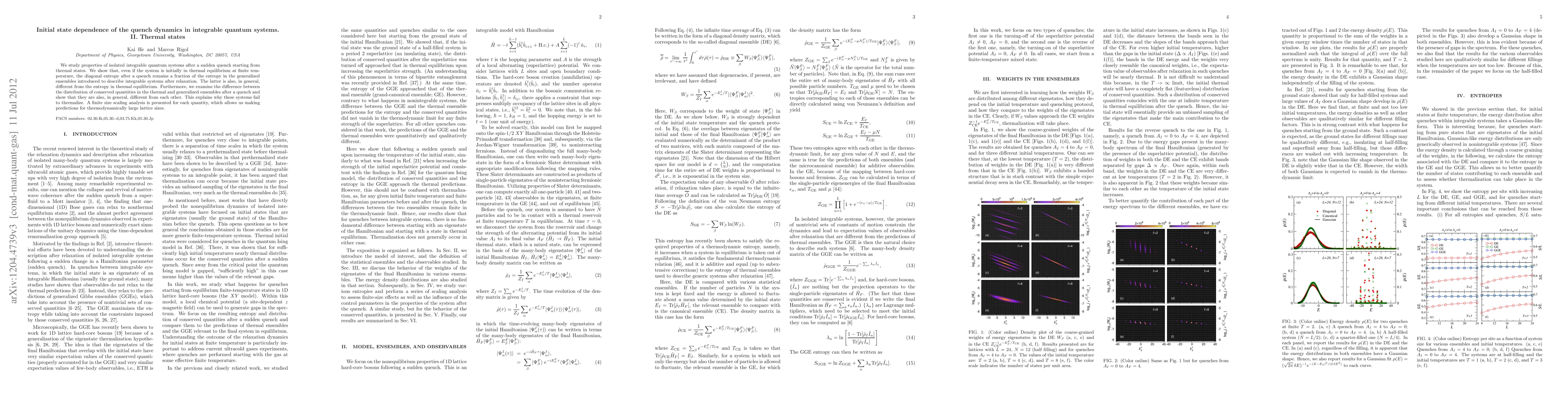 This paper investigates the dynamics of integrable quantum systems after a sudden quench from thermal states, revealing that the diagonal entropy post-quench is a fraction of the entropy in generalized ensembles. It also shows that the distributions of conserved quantities differ between thermal and generalized ensembles, explaining why these systems do not thermalize, and provides a finite size scaling analysis for predictions on large lattice sizes.