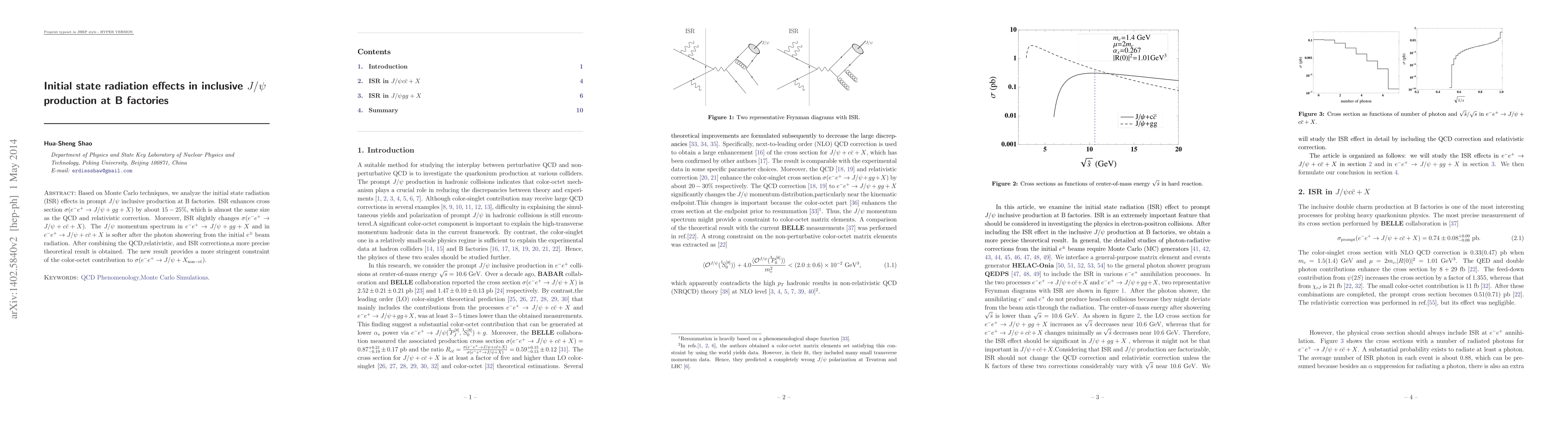 This paper analyzes initial state radiation effects in inclusive $J/\psi$ production at B factories using Monte Carlo techniques, finding that ISR enhances the cross section by $15-25\%$. The study also shows that ISR slightly modifies the $J/\psi$ momentum spectrum and provides a more precise theoretical result, offering a tighter constraint on the color-octet contribution.