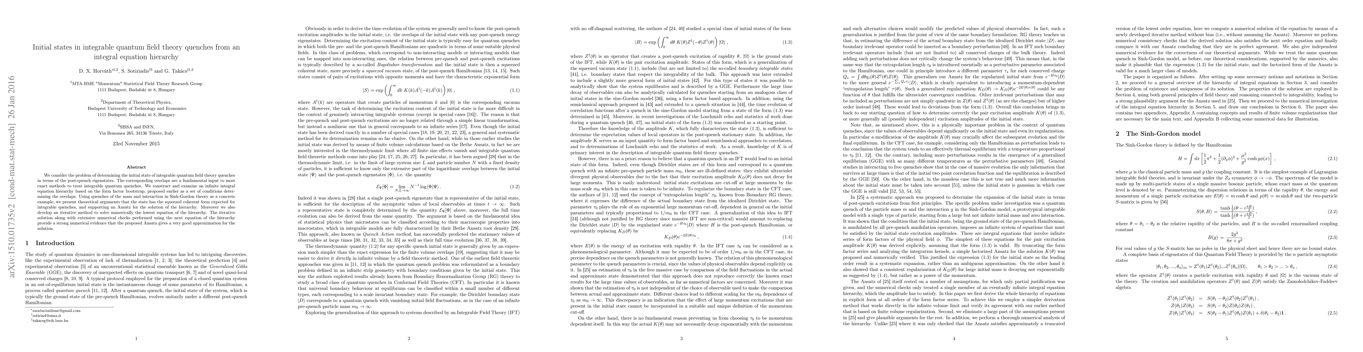 The work introduces a novel approach to construct initial states in integrable quantum field theory quenches, combining the form factor bootstrap with an infinite integral equation hierarchy, and validates it through theoretical arguments and numerical checks.