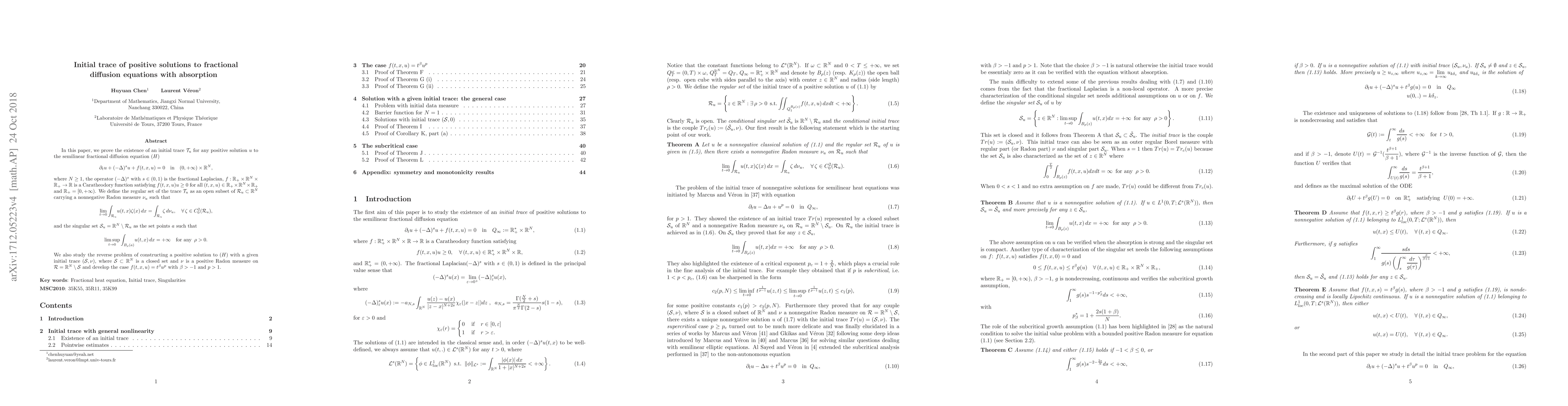 In this paper, we prove the existence of an initial trace T u of any positive solution u of the semilinear fractional diffusion equation (H) $\partial$ t u + (--$\Delta$) $\alpha$ u + f (t, x, u) = 0 in R * + $\times$ R N , where N $\ge$ 1 where the operator (--$\Delta$) $\alpha$ with $\alpha$ $\in$ (0, 1) is the fractional Laplacian and f : R + $\times$ R N $\times$ R + $\rightarrow$ R is a Caratheodory function satisfying f (t, x, u)u $\ge$ 0 for all (t, x, u) $\in$ R + $\times$ R N $\times$ R +. We define the regular set of the trace T u as an open subset of R u $\subset$ R N carrying a nonnegative Radon measive $\nu$ u such that lim t$\rightarrow$0 Ru u(t, x)$\zeta$(x)dx = Ru $\zeta$d$\nu$ $\forall$$\zeta$ $\in$ C 2 0 (R u), and the singular set S u = R N \ R u as the set points a such that lim sup t$\rightarrow$0 B$\rho$(a) u(t, x)dx = $\infty$ $\forall$$\rho$ \> 0. We study the reverse problem of constructing a positive solution to (H) with a given initial trace (S, $\nu$) where S $\subset$ R N is a closed set and $\nu$ is a positive Radon measure on R = R N \ S and develop the case f (t, x, u) = t $\beta$ u p where $\beta$ \> --1 and p \> 1.